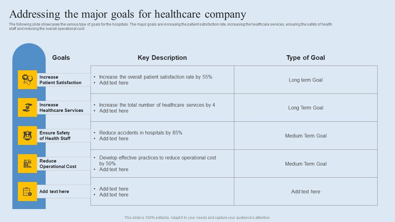 The following slide showcases the various type of goals for the hospitals. The major goals are increasing the patient satisfaction rate, increasing the healthcare services, ensuring the safety of health staff and reducing the overall operational cost. Slidegeeks is here to make your presentations a breeze with Addressing The Major Goals For Healthcare Company Mockup PDF With our easy to use and customizable templates, you can focus on delivering your ideas rather than worrying about formatting. With a variety of designs to choose from, you are sure to find one that suits your needs. And with animations and unique photos, illustrations, and fonts, you can make your presentation pop. So whether you are giving a sales pitch or presenting to the board, make sure to check out Slidegeeks first.