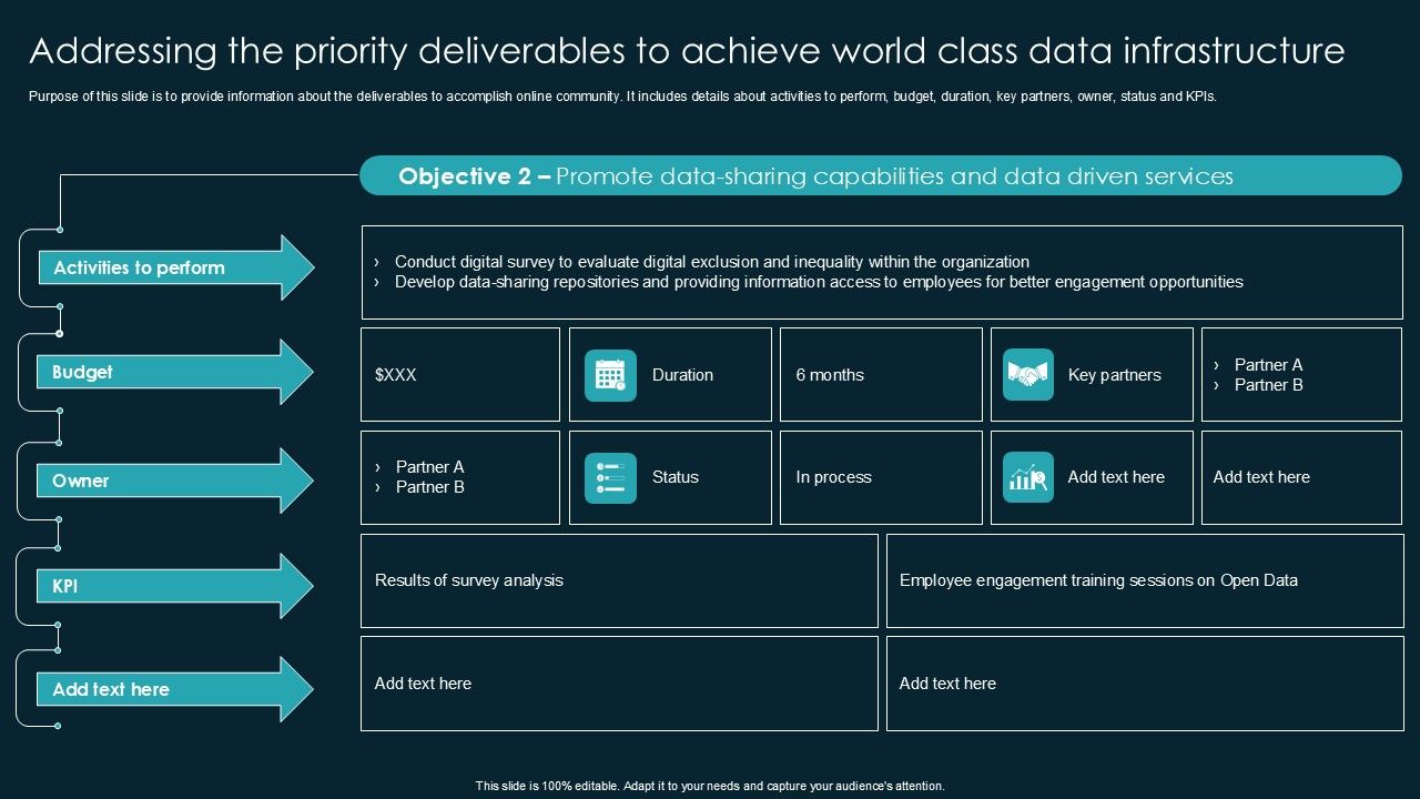 Purpose of this slide is to provide information about the deliverables to accomplish online community. It includes details about activities to perform, budget, duration, key partners, owner, status and KPIs. Are you in need of a template that can accommodate all of your creative concepts This one is crafted professionally and can be altered to fit any style. Use it with Google Slides or PowerPoint. Include striking photographs, symbols, depictions, and other visuals. Fill, move around, or remove text boxes as desired. Test out color palettes and font mixtures. Edit and save your work, or work with colleagues. Download Addressing The Priority Deliverables To Achieve World Class Data Infrastructure Information PDF and observe how to make your presentation outstanding. Give an impeccable presentation to your group and make your presentation unforgettable.