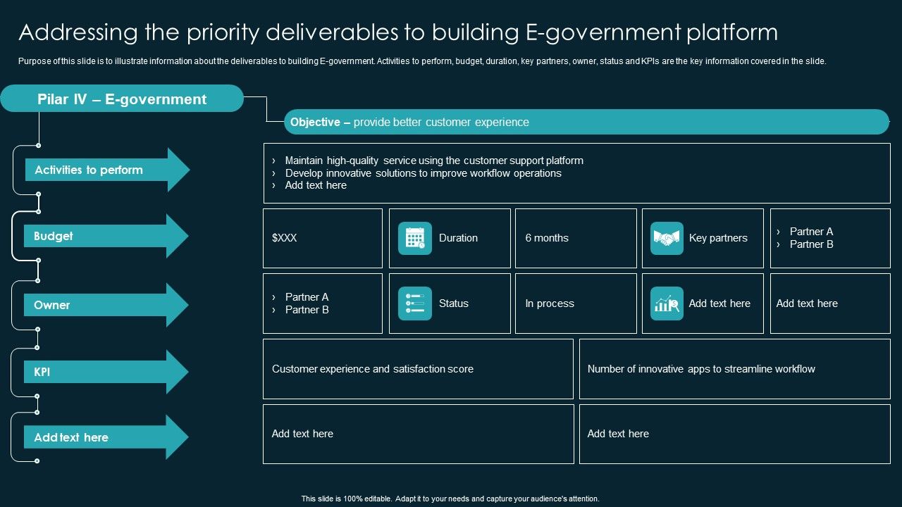 Purpose of this slide is to illustrate information about the deliverables to building E-government. Activities to perform, budget, duration, key partners, owner, status and KPIs are the key information covered in the slide. Crafting an eye catching presentation has never been more straightforward. Let your presentation shine with this tasteful yet straightforward Addressing The Priority Deliverables To Building E-Government Platform Rules PDF template. It offers a minimalistic and classy look that is great for making a statement. The colors have been employed intelligently to add a bit of playfulness while still remaining professional. Construct the ideal Addressing The Priority Deliverables To Building E-Government Platform Rules PDF that effortlessly grabs the attention of your audience Begin now and be certain to wow your customers.