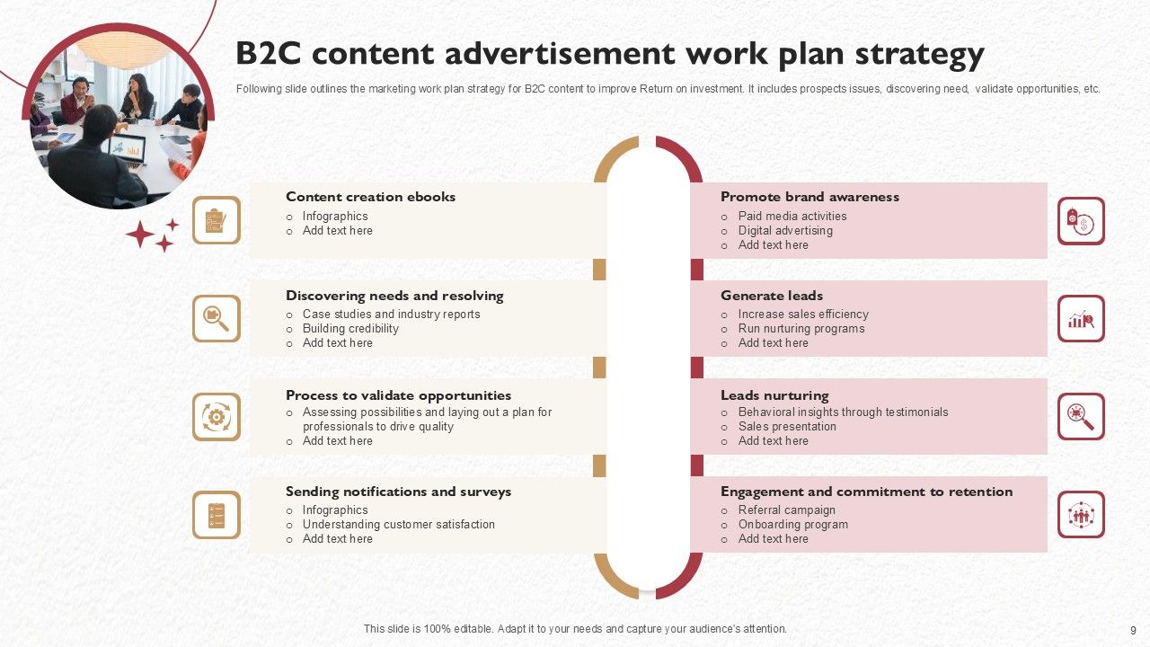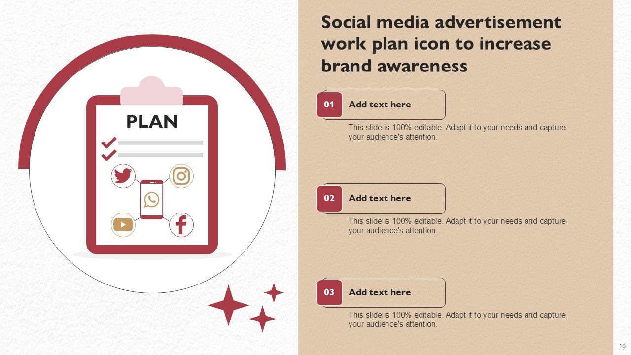 Improve your presentation delivery using this Advertisement Work Plan Ppt PowerPoint Presentation Complete Deck With Slides. Support your business vision and objectives using this well-structured PPT deck. This template offers a great starting point for delivering beautifully designed presentations on the topic of your choice. Comprising twelve this professionally designed template is all you need to host discussion and meetings with collaborators. Each slide is self-explanatory and equipped with high-quality graphics that can be adjusted to your needs. Therefore, you will face no difficulty in portraying your desired content using this PPT slideshow. This PowerPoint slideshow contains every important element that you need for a great pitch. It is not only editable but also available for immediate download and utilization. The color, font size, background, shapes everything can be modified to create your unique presentation layout. Therefore, download it now.