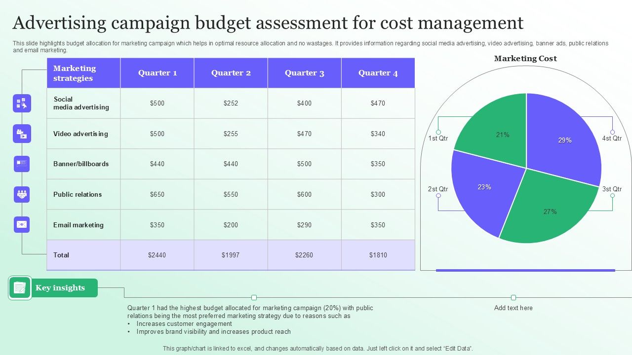 This slide highlights budget allocation for marketing campaign which helps in optimal resource allocation and no wastages. It provides information regarding social media advertising, video advertising, banner ads, public relations and email marketing. Showcasing this set of slides titled Advertising Campaign Budget Assessment For Cost Management Information PDF. The topics addressed in these templates are Social Media Advertising, Video Advertising, Banner Or Billboards, Public Relations, Email Marketing. All the content presented in this PPT design is completely editable. Download it and make adjustments in color, background, font etc. as per your unique business setting.