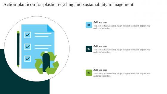Presenting Action Plan Icon For Plastic Recycling And Sustainability Management Template PDF to dispense important information. This template comprises three stages. It also presents valuable insights into the topics including Management, Action Plan, Recycling. This is a completely customizable PowerPoint theme that can be put to use immediately. So, download it and address the topic impactfully.