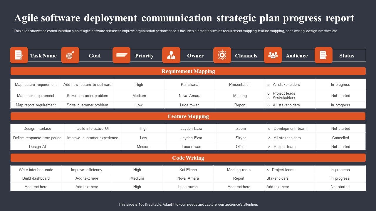 This slide showcase communication plan of agile software release to improve organization performance. It includes elements such as requirement mapping, feature mapping, code writing, design interface etc. Showcasing this set of slides titled Agile Software Deployment Communication Strategic Plan Progress Report Graphics PDF. The topics addressed in these templates are Progress Report, Audience, Status. All the content presented in this PPT design is completely editable. Download it and make adjustments in color, background, font etc. as per your unique business setting.