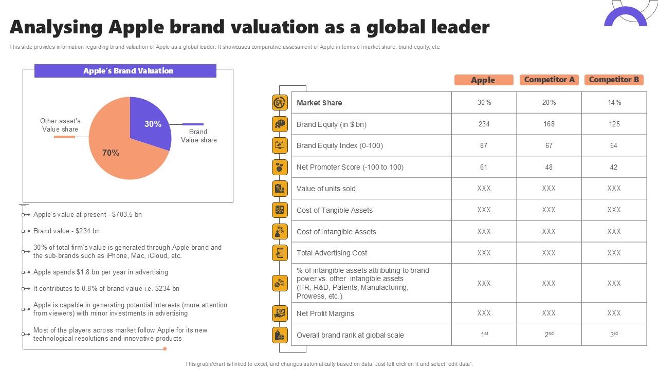 This slide provides information regarding brand valuation of Apple as a global leader. It showcases comparative assessment of Apple in terms of market share, brand equity, etc. Presenting this PowerPoint presentation, titled Analysing Apple Brand Valuation As A Global Leader Ppt Summary Images PDF, with topics curated by our researchers after extensive research. This editable presentation is available for immediate download and provides attractive features when used. Download now and captivate your audience. Presenting this Analysing Apple Brand Valuation As A Global Leader Ppt Summary Images PDF. Our researchers have carefully researched and created these slides with all aspects taken into consideration. This is a completely customizable Analysing Apple Brand Valuation As A Global Leader Ppt Summary Images PDF that is available for immediate downloading. Download now and make an impact on your audience. Highlight the attractive features available with our PPTs.