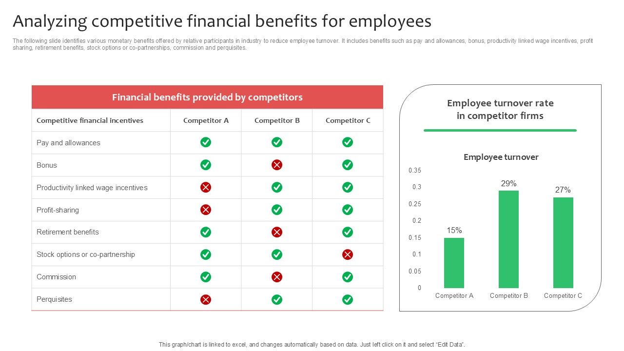 The following slide identifies various monetary benefits offered by relative participants in industry to reduce employee turnover. It includes benefits such as pay and allowances, bonus, productivity linked wage incentives, profit sharing, retirement benefits, stock options or co-partnerships, commission and perquisites. Presenting this PowerPoint presentation, titled Analyzing Competitive Financial Benefits For Employees Ppt Summary Topics PDF, with topics curated by our researchers after extensive research. This editable presentation is available for immediate download and provides attractive features when used. Download now and captivate your audience. Presenting this Analyzing Competitive Financial Benefits For Employees Ppt Summary Topics PDF. Our researchers have carefully researched and created these slides with all aspects taken into consideration. This is a completely customizable Analyzing Competitive Financial Benefits For Employees Ppt Summary Topics PDF that is available for immediate downloading. Download now and make an impact on your audience. Highlight the attractive features available with our PPTs.