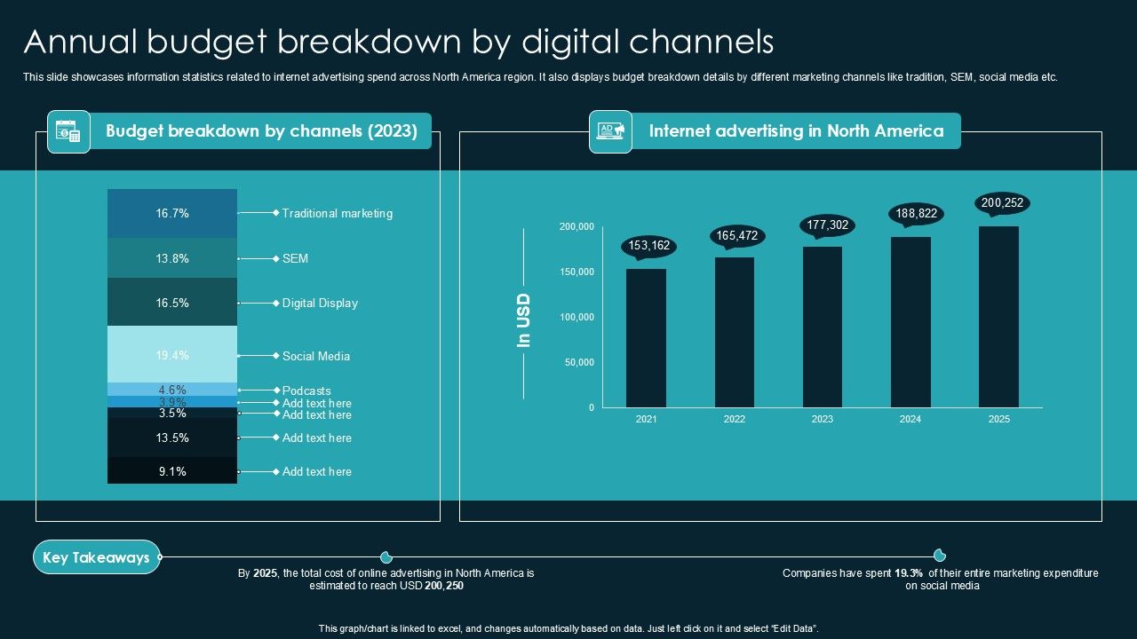 This slide showcases information statistics related to internet advertising spend across North America region. It also displays budget breakdown details by different marketing channels like tradition, SEM, social media etc. If you are looking for a format to display your unique thoughts, then the professionally designed Annual Budget Breakdown By Digital Channels Download PDF is the one for you. You can use it as a Google Slides template or a PowerPoint template. Incorporate impressive visuals, symbols, images, and other charts. Modify or reorganize the text boxes as you desire. Experiment with shade schemes and font pairings. Alter, share or cooperate with other people on your work. Download Annual Budget Breakdown By Digital Channels Download PDF and find out how to give a successful presentation. Present a perfect display to your team and make your presentation unforgettable.