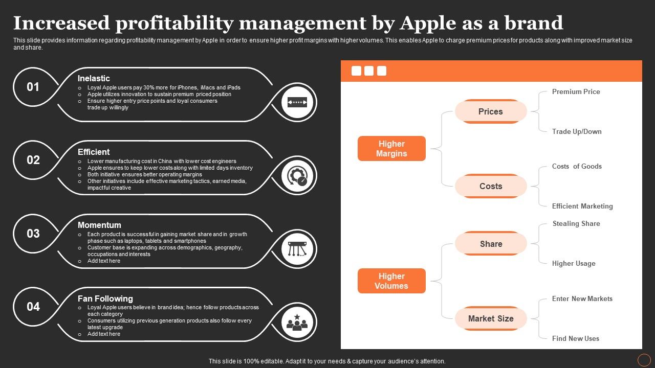 This slide provides information regarding profitability management by Apple in order to ensure higher profit margins with higher volumes. This enables Apple to charge premium prices for products along with improved market size and share. Explore a selection of the finest Apples Strategy To Achieve Top Brand Value Position Increased Profitability Management By Apple As A Brand Infographics PDF here. With a plethora of professionally designed and pre made slide templates, you can quickly and easily find the right one for your upcoming presentation. You can use our Apples Strategy To Achieve Top Brand Value Position Increased Profitability Management By Apple As A Brand Infographics PDF to effectively convey your message to a wider audience. Slidegeeks has done a lot of research before preparing these presentation templates. The content can be personalized and the slides are highly editable. Grab templates today from Slidegeeks.