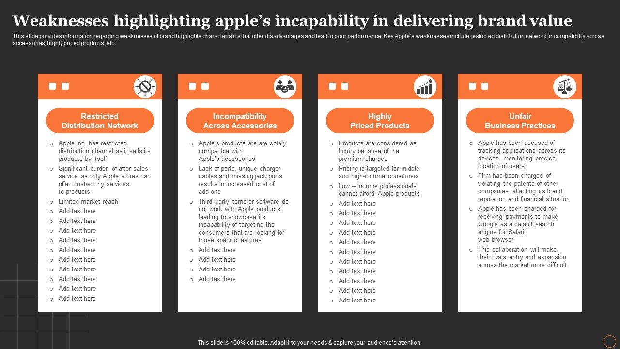 This slide provides information regarding weaknesses of brand highlights characteristics that offer disadvantages and lead to poor performance. Key Apples weaknesses include restricted distribution network, incompatibility across accessories, highly priced products, etc. There are so many reasons you need a Apples Strategy To Achieve Top Brand Value Position Weaknesses Highlighting Apples Incapability In Delivering Brand Demonstration PDF. The first reason is you cannot spend time making everything from scratch, Thus, Slidegeeks has made presentation templates for you too. You can easily download these templates from our website easily.