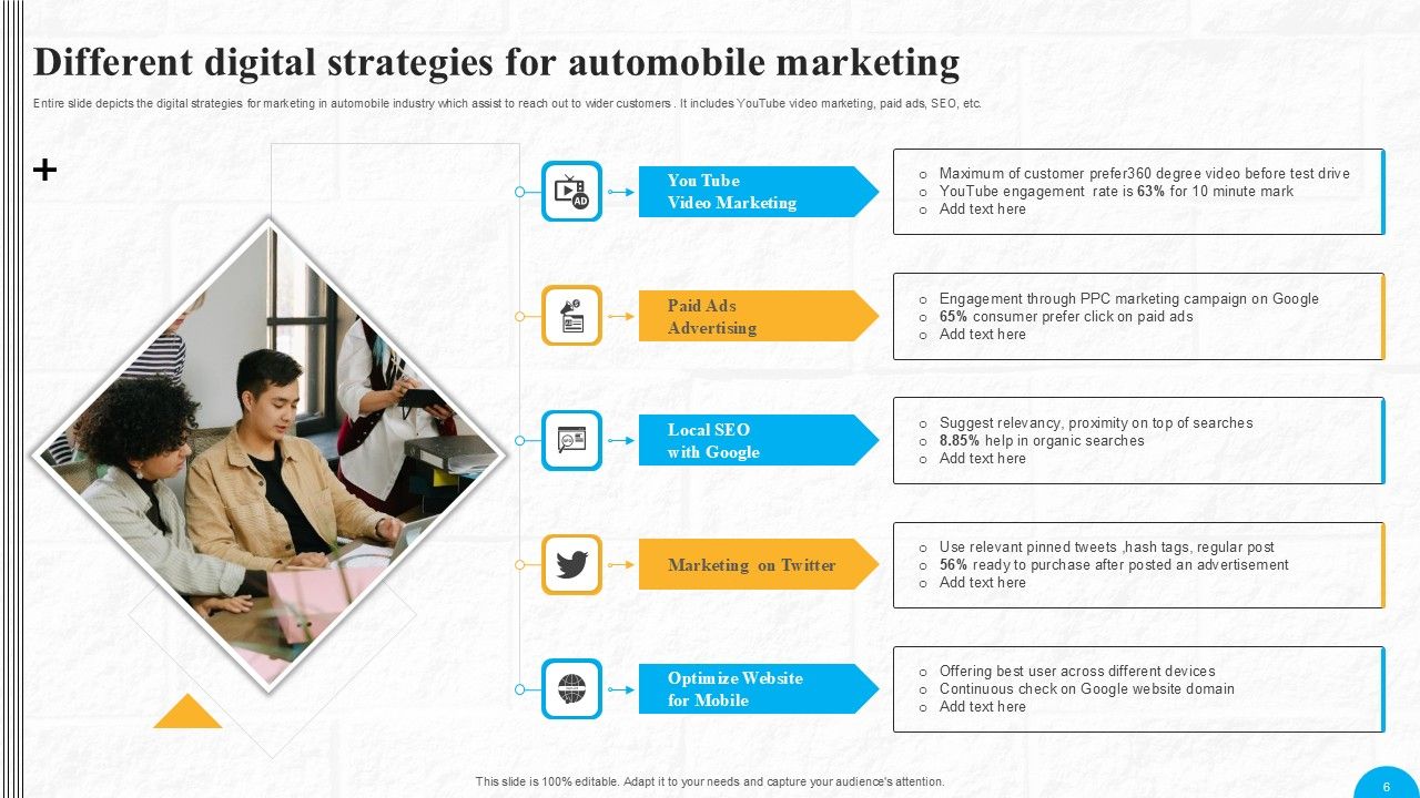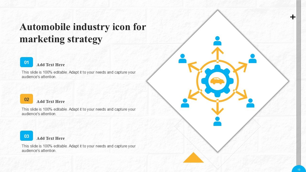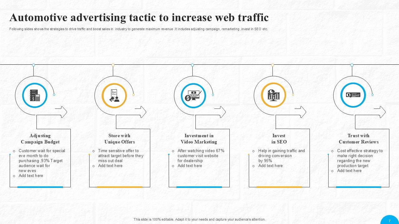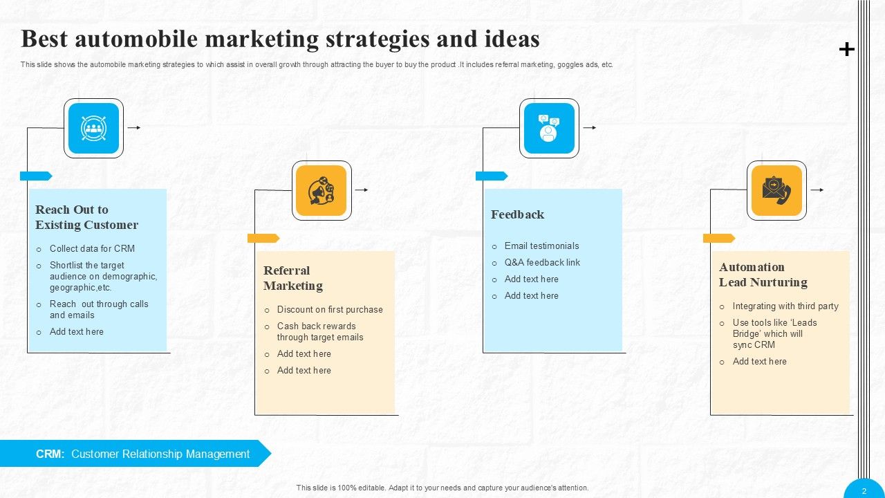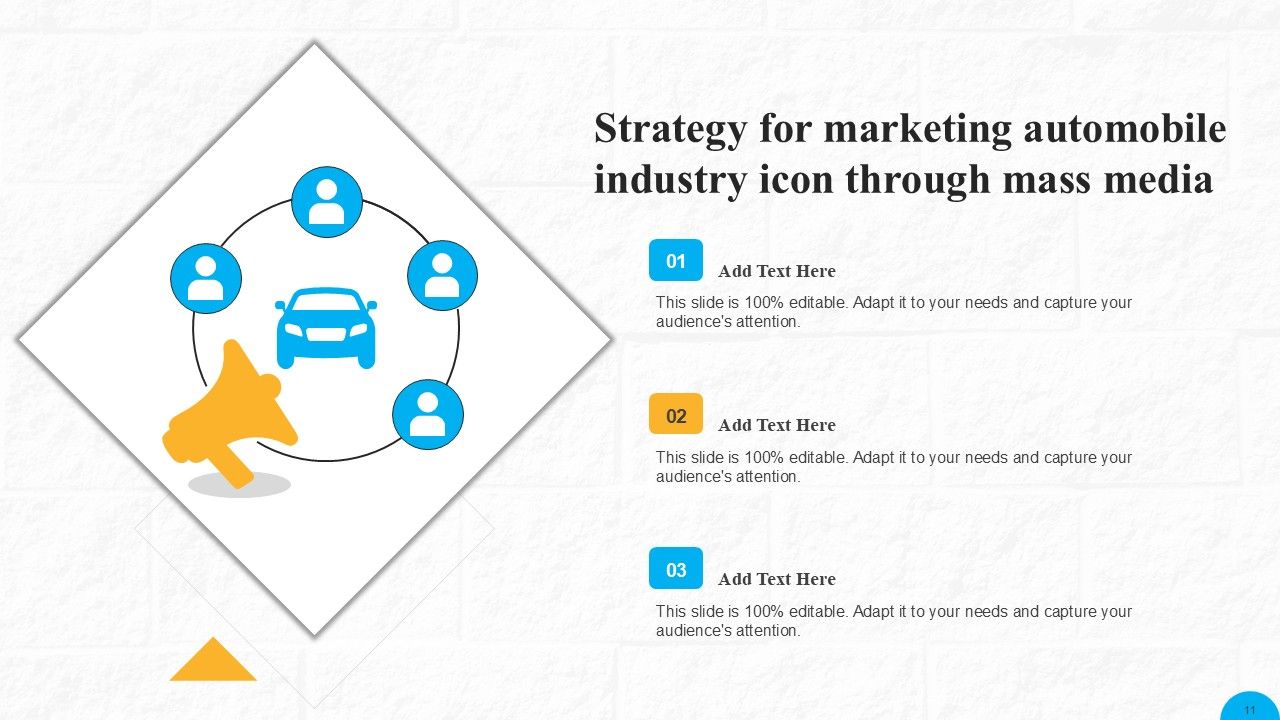 Improve your presentation delivery using this Automotive Advertising Tactic Ppt PowerPoint Presentation Complete Deck With Slides. Support your business vision and objectives using this well-structured PPT deck. This template offers a great starting point for delivering beautifully designed presentations on the topic of your choice. Comprising twelve this professionally designed template is all you need to host discussion and meetings with collaborators. Each slide is self-explanatory and equipped with high-quality graphics that can be adjusted to your needs. Therefore, you will face no difficulty in portraying your desired content using this PPT slideshow. This PowerPoint slideshow contains every important element that you need for a great pitch. It is not only editable but also available for immediate download and utilization. The color, font size, background, shapes everything can be modified to create your unique presentation layout. Therefore, download it now.