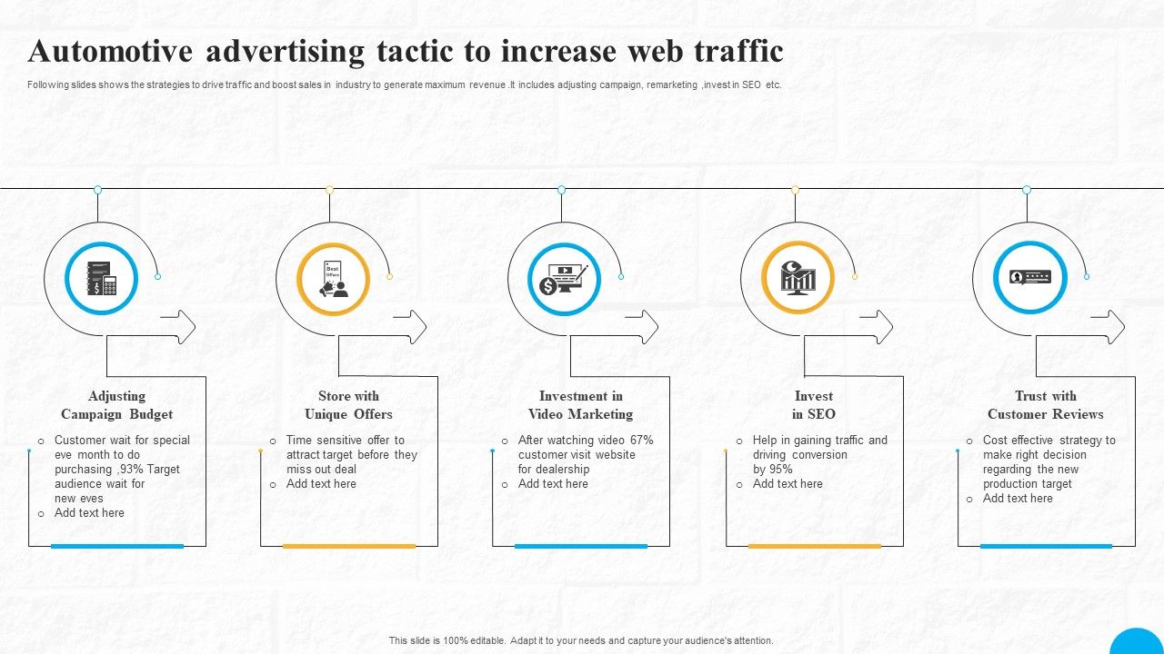 Following slides shows the strategies to drive traffic and boost sales in industry to generate maximum revenue .It includes adjusting campaign, remarketing ,invest in SEO etc. Presenting Automotive Advertising Tactic To Increase Web Traffic Infographics PDF to dispense important information. This template comprises five stages. It also presents valuable insights into the topics including Adjusting Campaign Budget, Store Unique Offers, Investment Video Marketing. This is a completely customizable PowerPoint theme that can be put to use immediately. So, download it and address the topic impactfully.