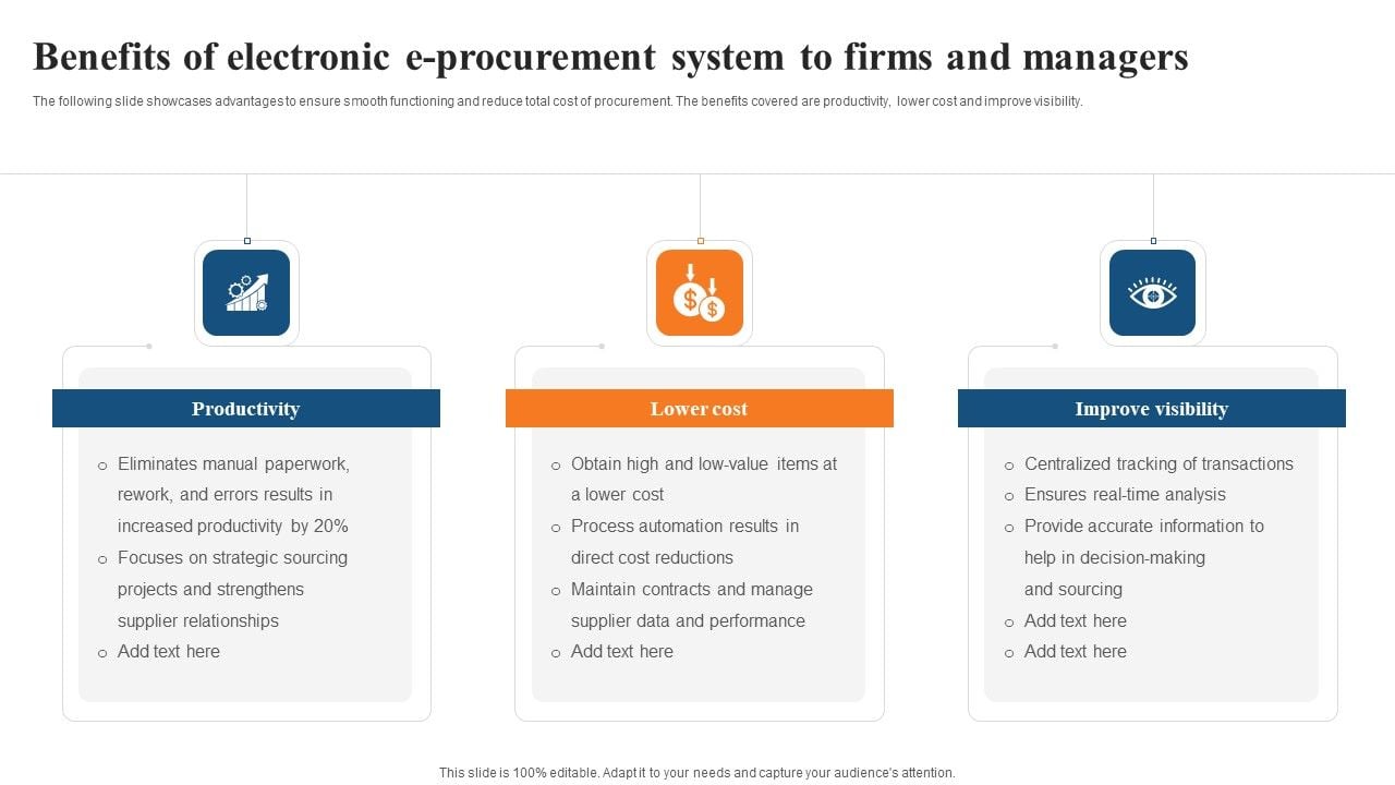 The following slide showcases advantages to ensure smooth functioning and reduce total cost of procurement. The benefits covered are productivity, lower cost and improve visibility. Presenting Benefits Of Electronic E Procurement System To Firms And Managers Graphics PDF to dispense important information. This template comprises three stages. It also presents valuable insights into the topics including Lower Cost, Improve Visibility, Productivity. This is a completely customizable PowerPoint theme that can be put to use immediately. So, download it and address the topic impactfully.