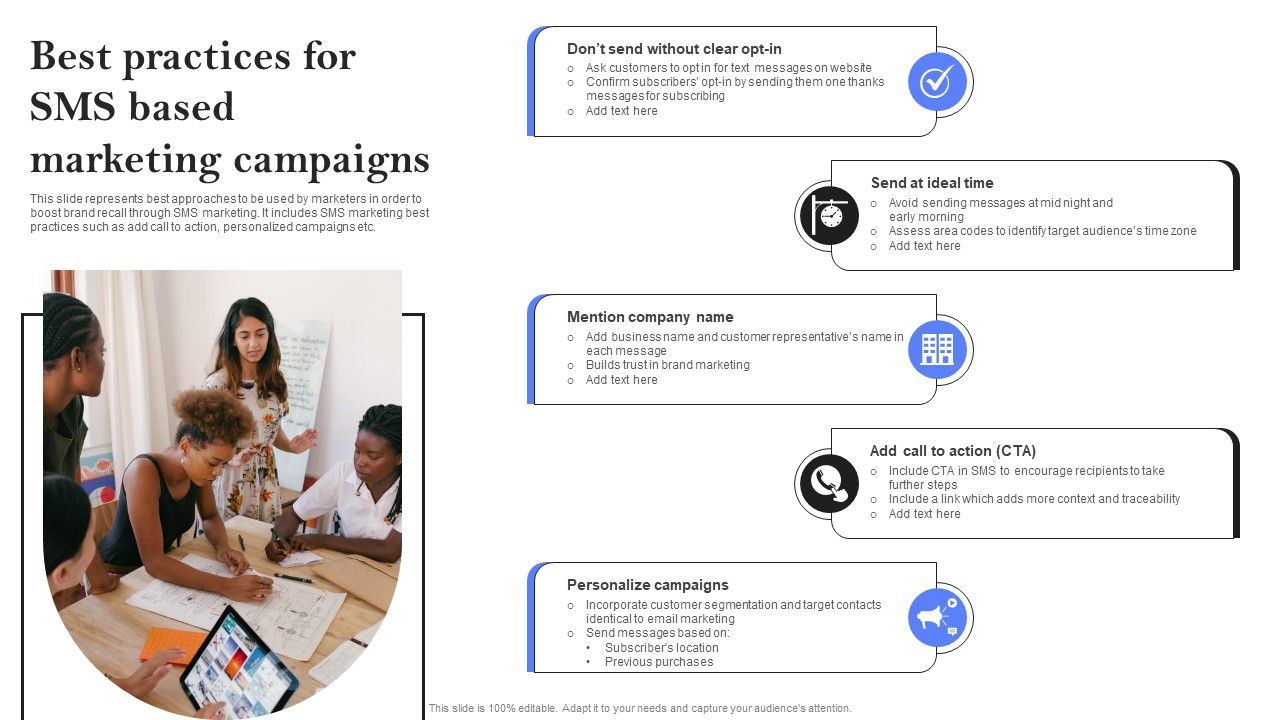 This slide represents best approaches to be used by marketers in order to boost brand recall through SMS marketing. It includes SMS marketing best practices such as add call to action, personalized campaigns etc. Are you in need of a template that can accommodate all of your creative concepts This one is crafted professionally and can be altered to fit any style. Use it with Google Slides or PowerPoint. Include striking photographs, symbols, depictions, and other visuals. Fill, move around, or remove text boxes as desired. Test out color palettes and font mixtures. Edit and save your work, or work with colleagues. Download Best Practices For SMS Based Marketing Campaigns Ppt PowerPoint Presentation File Inspiration PDF and observe how to make your presentation outstanding. Give an impeccable presentation to your group and make your presentation unforgettable.