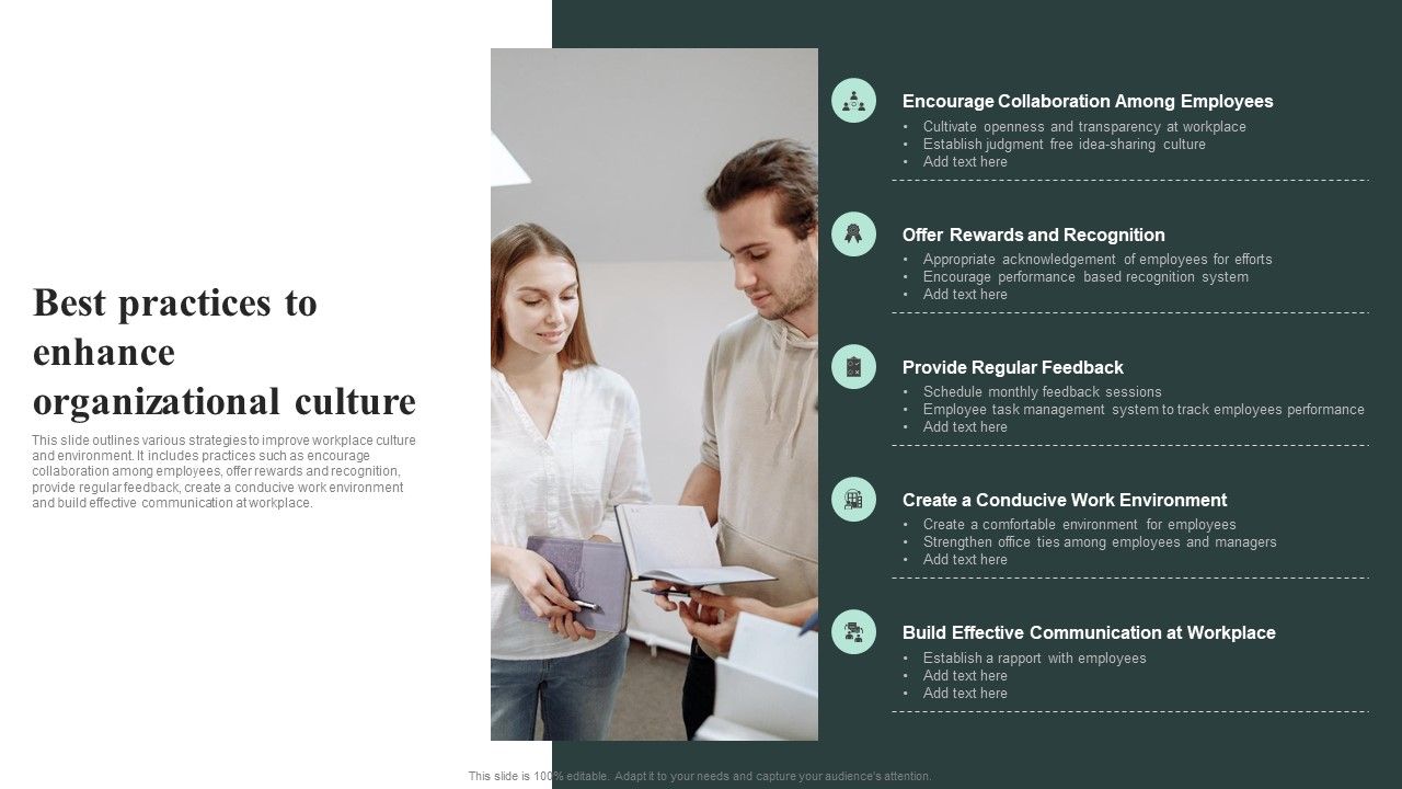 This slide outlines various strategies to improve workplace culture and environment. It includes practices such as encourage collaboration among employees, offer rewards and recognition, provide regular feedback, create a conducive work environment and build effective communication at workplace. Whether you have daily or monthly meetings, a brilliant presentation is necessary. Best Practices To Enhance Organizational Culture Designs PDF can be your best option for delivering a presentation. Represent everything in detail using Best Practices To Enhance Organizational Culture Designs PDF and make yourself stand out in meetings. The template is versatile and follows a structure that will cater to your requirements. All the templates prepared by Slidegeeks are easy to download and edit. Our research experts have taken care of the corporate themes as well. So, give it a try and see the results.