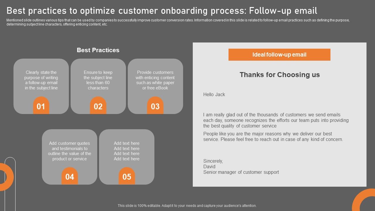Best Practices To Optimize Customer Onboarding Process Follow Up Email Designs PDF with all 9 slides: