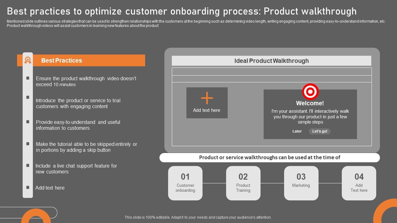 Mentioned slide outlines various strategies that can be used to strengthen relationships with the customers at the beginning such as determining video length, writing engaging content, providing easy-to-understand information, etc. Product walkthrough videos will assist customers in learning new features about the product. Make sure to capture your audiences attention in your business displays with our gratis customizable Best Practices To Optimize Customer Onboarding Process Product Walkthrough Infographics PDF. These are great for business strategies, office conferences, capital raising or task suggestions. If you desire to acquire more customers for your tech business and ensure they stay satisfied, create your own sales presentation with these plain slides.