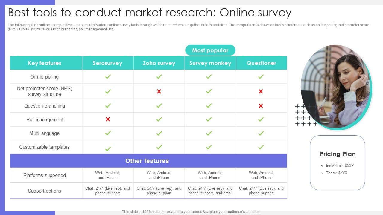 The following slide outlines comparative assessment of various online survey tools through which researchers can gather data in real-time. The comparison is drawn on basis of features such as online polling, net promoter score NPS survey structure, question branching, poll management, etc. Make sure to capture your audiences attention in your business displays with our gratis customizable Best Tools To Conduct Market Research Online Survey Ppt Professional Slides PDF. These are great for business strategies, office conferences, capital raising or task suggestions. If you desire to acquire more customers for your tech business and ensure they stay satisfied, create your own sales presentation with these plain slides.