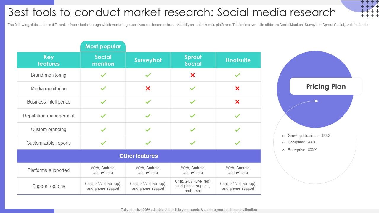 The following slide outlines different software tools through which marketing executives can increase brand visibility on social media platforms. The tools covered in slide are Social Mention, Surveybot, Sprout Social, and Hootsuite. Slidegeeks is one of the best resources for PowerPoint templates. You can download easily and regulate Best Tools To Conduct Market Research Social Media Research Pictures PDF for your personal presentations from our wonderful collection. A few clicks is all it takes to discover and get the most relevant and appropriate templates. Use our Templates to add a unique zing and appeal to your presentation and meetings. All the slides are easy to edit and you can use them even for advertisement purposes.