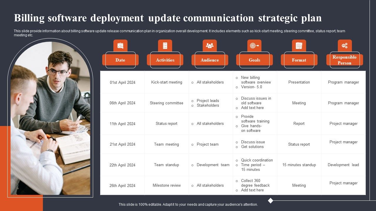 This slide provide information about billing software update release communication plan in organization overall development. It includes elements such as kick-start meeting, steering committee, status report, team meeting etc. Presenting Billing Software Deployment Update Communication Strategic Plan Guidelines PDF to dispense important information. This template comprises one stages. It also presents valuable insights into the topics including Activities, Audience, Goals . This is a completely customizable PowerPoint theme that can be put to use immediately. So, download it and address the topic impactfully.