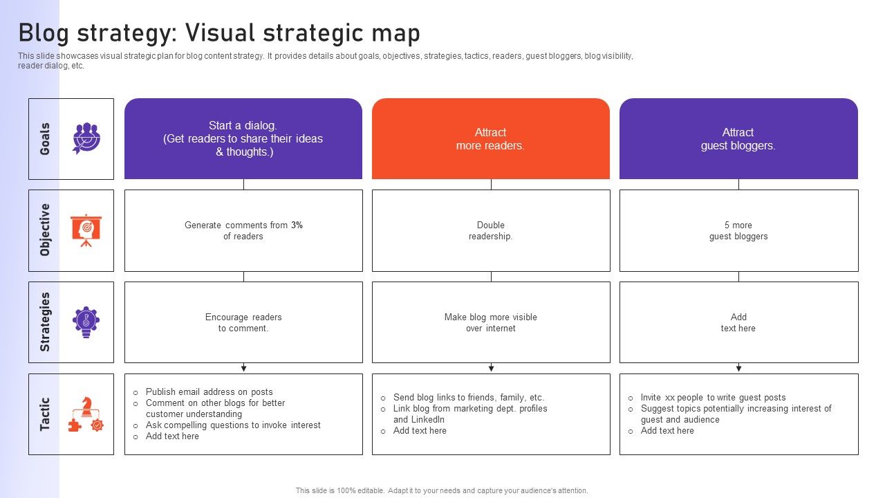 This slide showcases visual strategic plan for blog content strategy. It provides details about goals, objectives, strategies, tactics, readers, guest bloggers, blog visibility, reader dialog, etc. Presenting this PowerPoint presentation, titled Blog Strategy Visual Strategic Map Ppt PowerPoint Presentation Diagram Images PDF, with topics curated by our researchers after extensive research. This editable presentation is available for immediate download and provides attractive features when used. Download now and captivate your audience. Presenting this Blog Strategy Visual Strategic Map Ppt PowerPoint Presentation Diagram Images PDF. Our researchers have carefully researched and created these slides with all aspects taken into consideration. This is a completely customizable Blog Strategy Visual Strategic Map Ppt PowerPoint Presentation Diagram Images PDF that is available for immediate downloading. Download now and make an impact on your audience. Highlight the attractive features available with our PPTs.