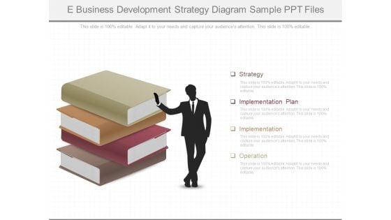 This is a e business development strategy diagram sample ppt files. This is a four stage process. The stages in this process are strategy, implementation plan, implementation, operation.
