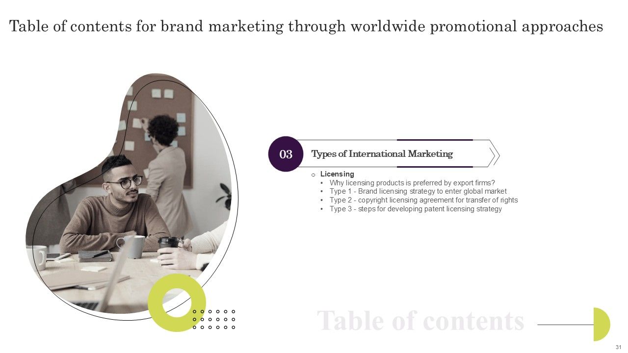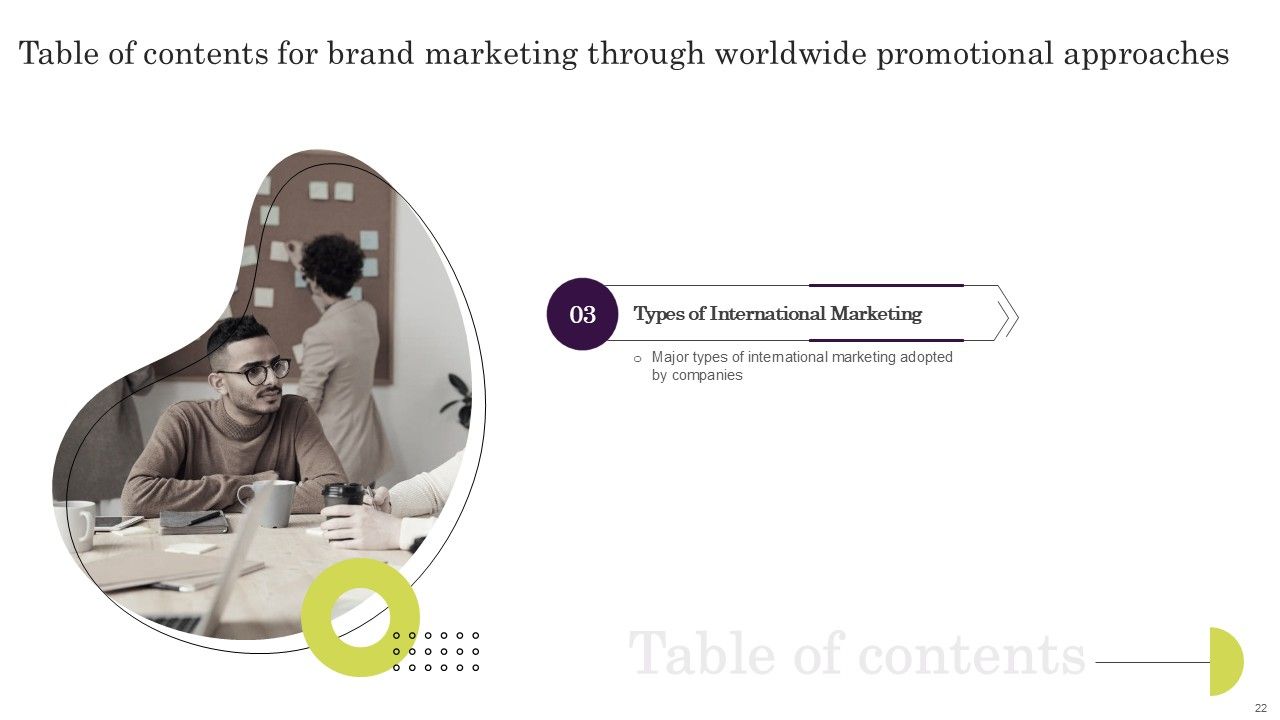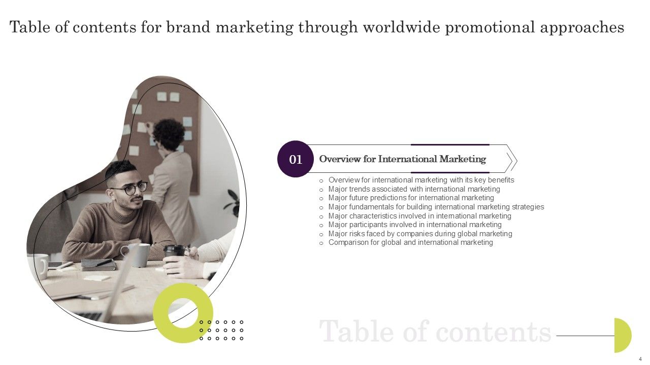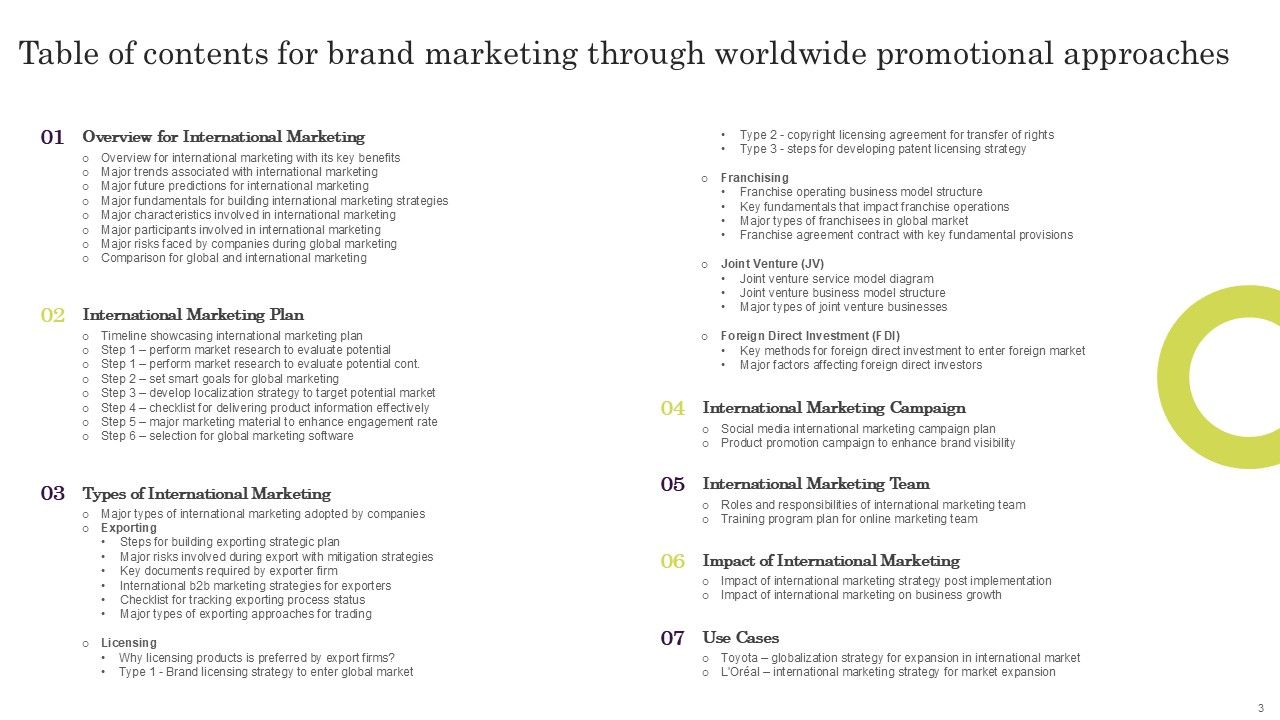 Take advantage of this well-researched and professionally-designed Brand Marketing Through Worldwide Promotional Approaches Ppt PowerPoint Presentation Complete Deck With Slides to ace your next business meeting. Use this PPT complete deck to impress the management with your ideas for business growth and revenue increase. Use the seventy three slide Template Bundle to leave no stone unturned as you present each step of your process. Employ the visual tools within the slides such as graphs, charts, and tables to ensure that the audience can never look away from the presentation. With attractive visuals, easy to understand structure, and your knowledge, your presentation will have the attention it deserves. Download this PPT Template from the link below.
