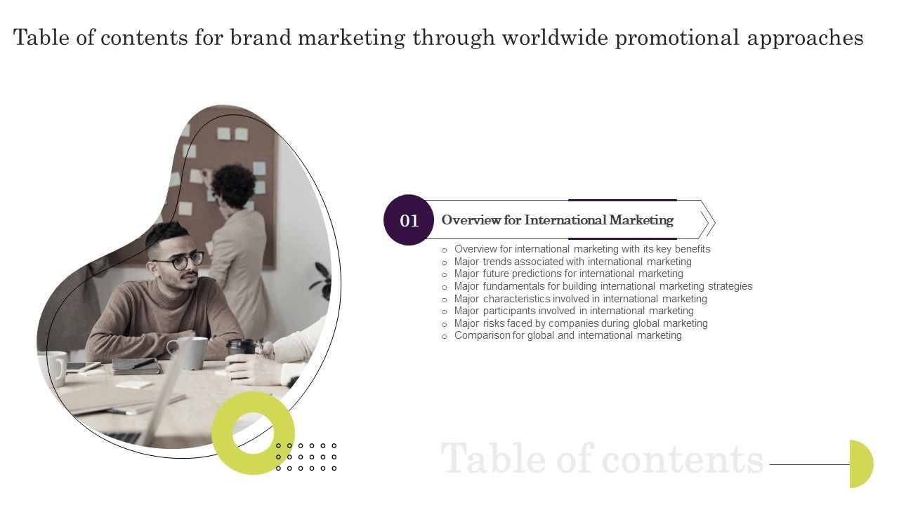 Brand Marketing Through Worldwide Promotional Approaches Table Of Contents Microsoft PDF with all 9 slides: