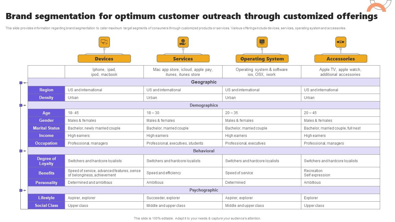 This slide provides information regarding brand segmentation to cater maximum target segments of consumers through customized products or services. Various offerings include devices, services, operating system and accessories. Boost your pitch with our creative Brand Segmentation For Optimum Customer Outreach Through Customized Offerings Introduction PDF. Deliver an awe inspiring pitch that will mesmerize everyone. Using these presentation templates you will surely catch everyones attention. You can browse the ppts collection on our website. We have researchers who are experts at creating the right content for the templates. So you do not have to invest time in any additional work. Just grab the template now and use them.