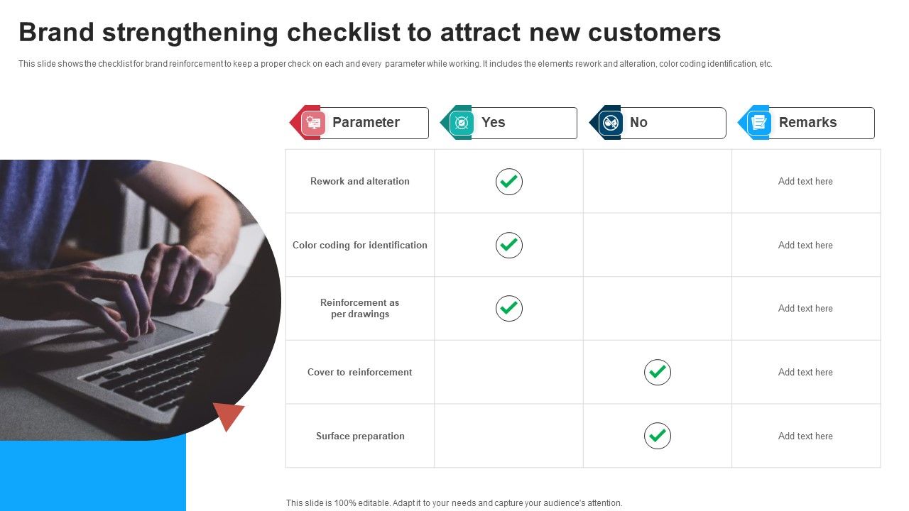 This slide shows the checklist for brand reinforcement to keep a proper check on each and every parameter while working. It includes the elements rework and alteration, color coding identification, etc. Presenting Brand Strengthening Checklist To Attract New Customers Designs PDF to dispense important information. This template comprises one stages. It also presents valuable insights into the topics including Rework Alteration, Color Coding Identification, Cover Reinforcement. This is a completely customizable PowerPoint theme that can be put to use immediately. So, download it and address the topic impactfully.