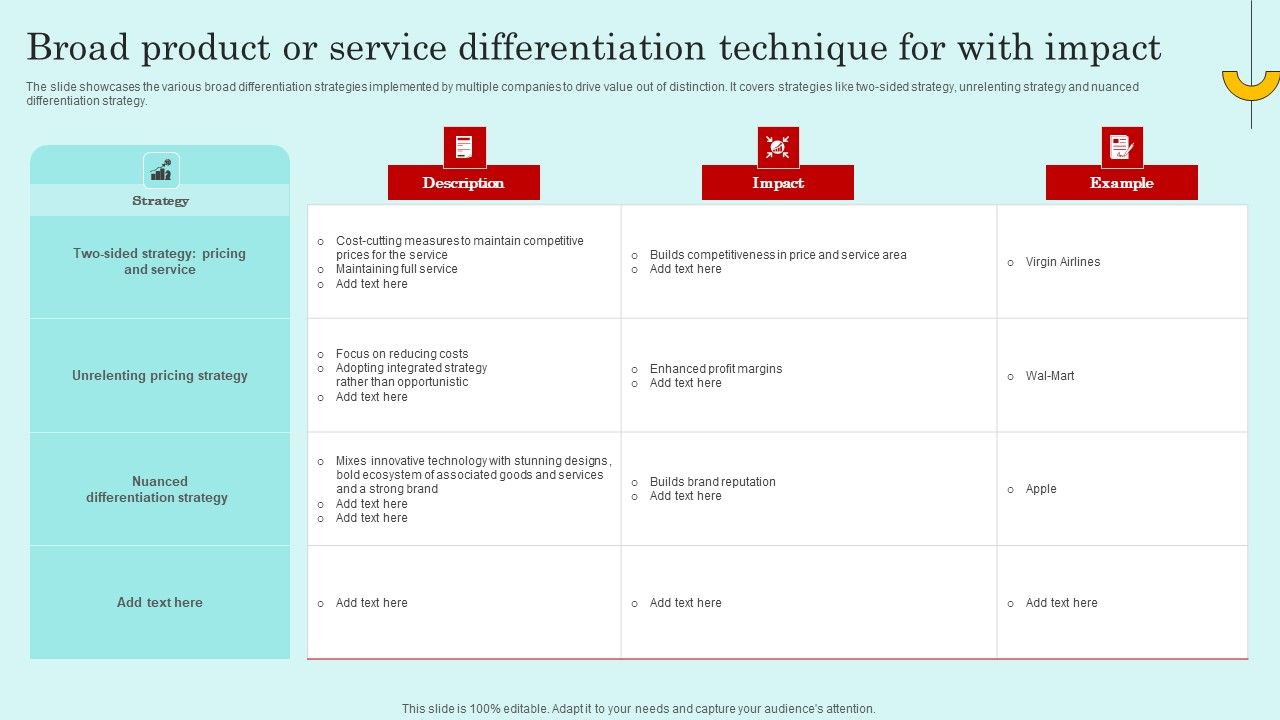 The slide showcases the various broad differentiation strategies implemented by multiple companies to drive value out of distinction. It covers strategies like two-sided strategy, unrelenting strategy and nuanced differentiation strategy. Showcasing this set of slides titled Broad Product Or Service Differentiation Technique For With Impact Microsoft PDF. The topics addressed in these templates are Pricing Service, Focus Reducing Costs, Adopting Integrated Strategy . All the content presented in this PPT design is completely editable. Download it and make adjustments in color, background, font etc. as per your unique business setting.
