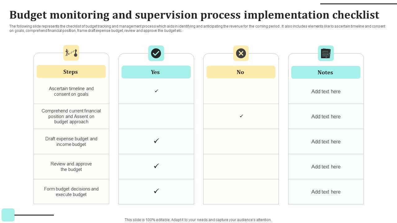 The following slide represents the checklist of budget tracking and management process which aids in identifying and anticipating the revenue for the coming period . It also includes elements like to ascertain timeline and consent on goals, comprehend financial position, frame draft expense budget, review and approve the budget etc. Pitch your topic with ease and precision using this Budget Monitoring And Supervision Process Implementation Checklist Sample PDF. This layout presents information on Steps, Notes, Checklist. It is also available for immediate download and adjustment. So, changes can be made in the color, design, graphics or any other component to create a unique layout.