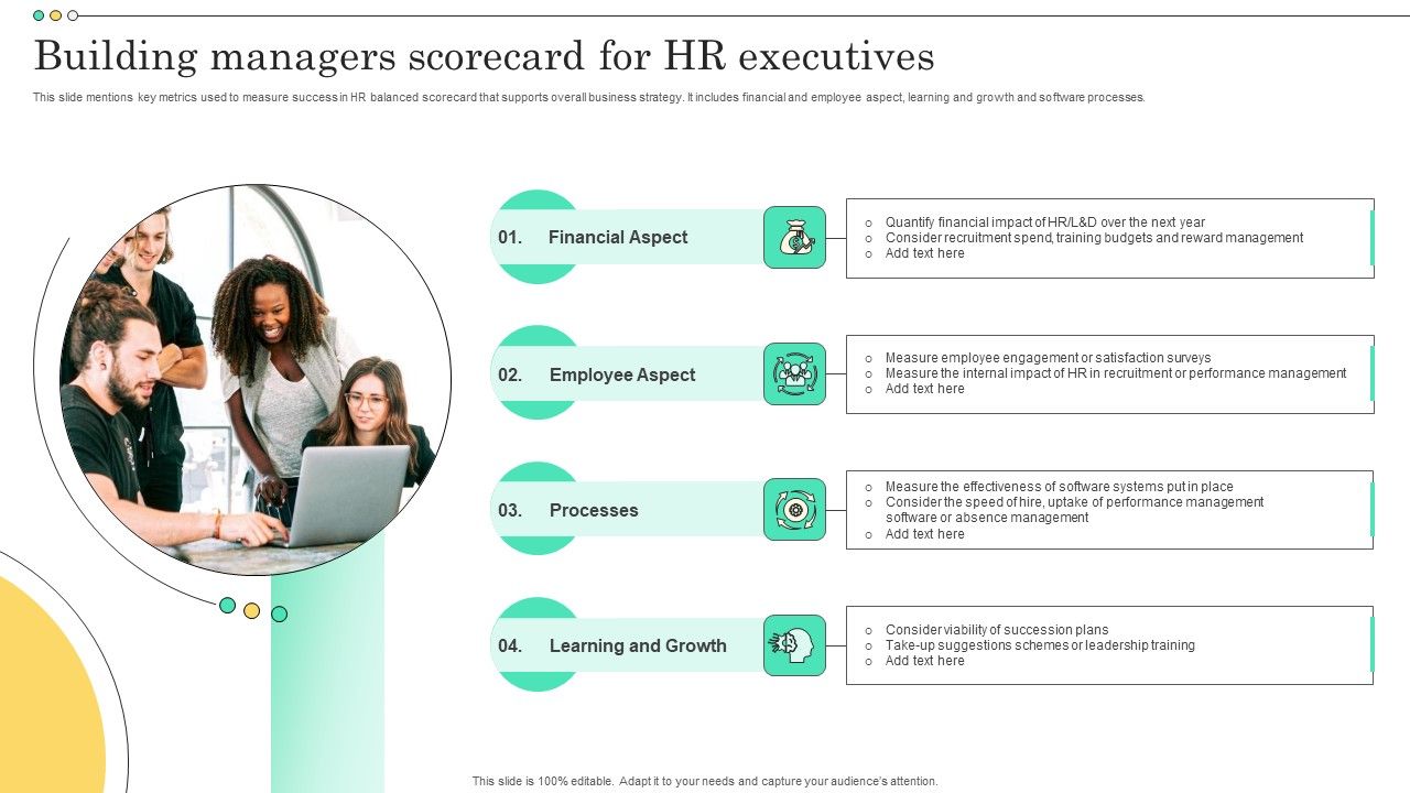This slide mentions key metrics used to measure success in HR balanced scorecard that supports overall business strategy. It includes financial and employee aspect, learning and growth and software processes. Persuade your audience using this Building Managers Scorecard For HR Executives Ideas PDF. This PPT design covers four stages, thus making it a great tool to use. It also caters to a variety of topics including Financial Aspect, Employee Aspect, Processes. Download this PPT design now to present a convincing pitch that not only emphasizes the topic but also showcases your presentation skills.