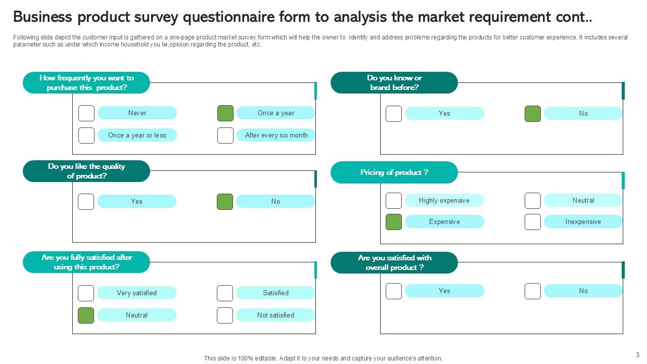 This Business Product Survey Questionnaire Ppt PowerPoint Presentation Complete Deck With Slides Survey acts as backup support for your ideas, vision, thoughts, etc. Use it to present a thorough understanding of the topic. This PPT slideshow can be utilized for both in-house and outside presentations depending upon your needs and business demands. Entailing five slides with a consistent design and theme, this template will make a solid use case. As it is intuitively designed, it suits every business vertical and industry. All you have to do is make a few tweaks in the content or any other component to design unique presentations. The biggest advantage of this complete deck is that it can be personalized multiple times once downloaded. The color, design, shapes, and other elements are free to modify to add personal touches. You can also insert your logo design in this PPT layout. Therefore a well-thought and crafted presentation can be delivered with ease and precision by downloading this Business Product Survey Questionnaire Ppt PowerPoint Presentation Complete Deck With Slides Survey PPT slideshow.
