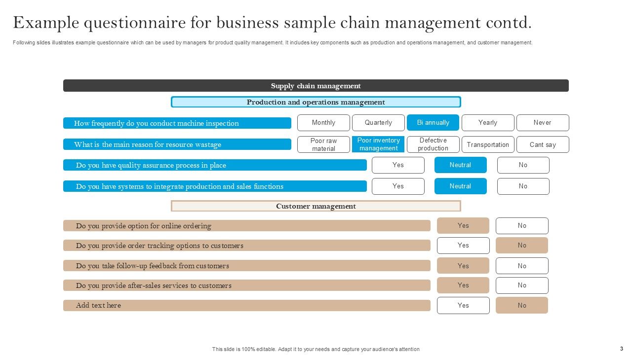 Improve your presentation delivery using this Business Questionnaire Sample Ppt PowerPoint Presentation Complete Deck With Slides Survey. Support your business vision and objectives using this well-structured PPT deck. This template offers a great starting point for delivering beautifully designed presentations on the topic of your choice. Comprising six this professionally designed template is all you need to host discussion and meetings with collaborators. Each slide is self-explanatory and equipped with high-quality graphics that can be adjusted to your needs. Therefore, you will face no difficulty in portraying your desired content using this PPT slideshow. This PowerPoint slideshow contains every important element that you need for a great pitch. It is not only editable but also available for immediate download and utilization. The color, font size, background, shapes everything can be modified to create your unique presentation layout. Therefore, download it now.
