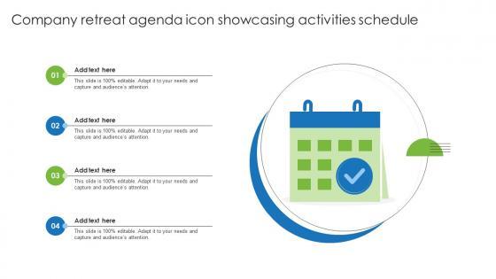 Pitch your topic with ease and precision using this Company Retreat Agenda Icon Showcasing Activities Schedule Designs Pdf. This layout presents information on Company, Retreat, Agenda. It is also available for immediate download and adjustment. So, changes can be made in the color, design, graphics or any other component to create a unique layout.