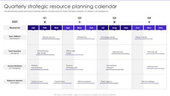 From laying roadmaps to briefing everything in detail, our templates are perfect for you. You can set the stage with your presentation slides. All you have to do is download these easy-to-edit and customizable templates. Quarterly Strategic Resource Planning Calendar will help you deliver an outstanding performance that everyone would remember and praise you for. Do download this presentation today.