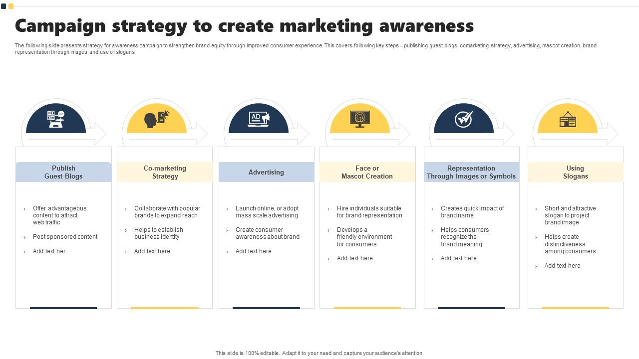 The following slide presents strategy for awareness campaign to strengthen brand equity through improved consumer experience. This covers following key steps publishing guest blogs, comarketing strategy, advertising, mascot creation, brand representation through images and use of slogans Presenting Campaign Strategy To Create Marketing Awareness Brochure PDF to dispense important information. This template comprises six stages. It also presents valuable insights into the topics including Publish Guest Blogs, Advertising, Marketing Strategy . This is a completely customizable PowerPoint theme that can be put to use immediately. So, download it and address the topic impactfully.