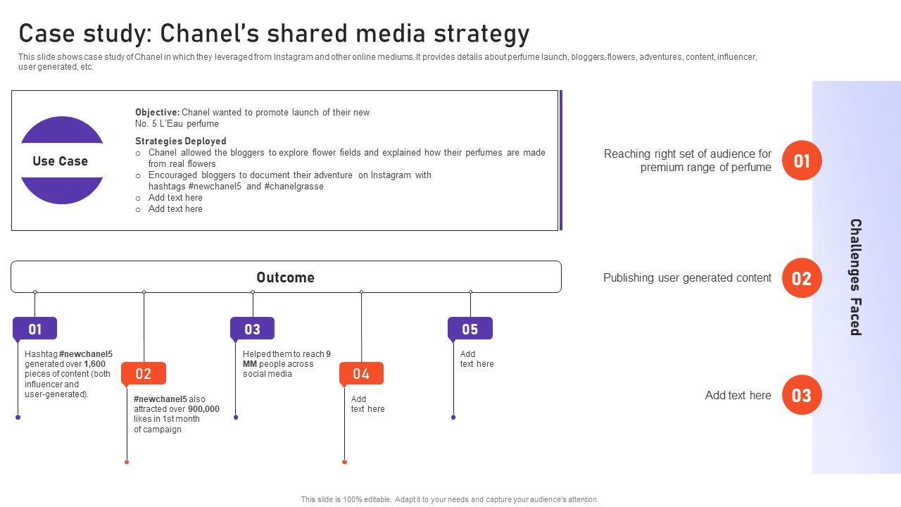 This slide shows case study of Chanel in which they leveraged from Instagram and other online mediums. It provides details about perfume launch, bloggers, flowers, adventures, content, influencer, user generated, etc. Are you in need of a template that can accommodate all of your creative concepts This one is crafted professionally and can be altered to fit any style. Use it with Google Slides or PowerPoint. Include striking photographs, symbols, depictions, and other visuals. Fill, move around, or remove text boxes as desired. Test out color palettes and font mixtures. Edit and save your work, or work with colleagues. Download Case Study Chanels Shared Media Strategy Ppt PowerPoint Presentation File Example File PDF and observe how to make your presentation outstanding. Give an impeccable presentation to your group and make your presentation unforgettable.
