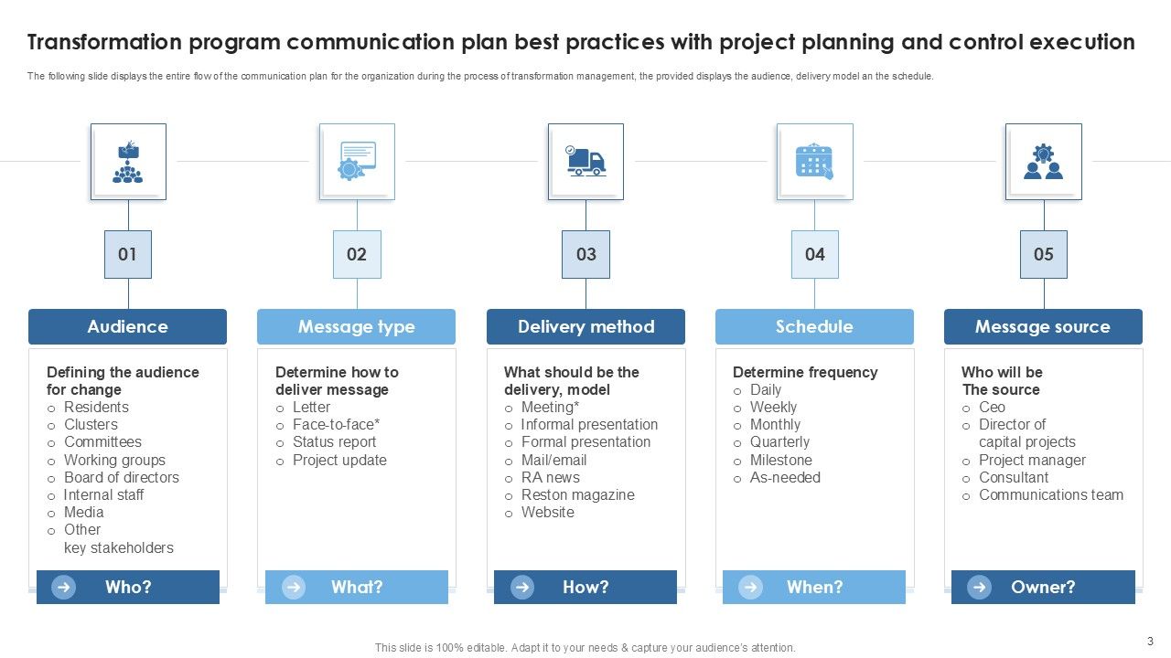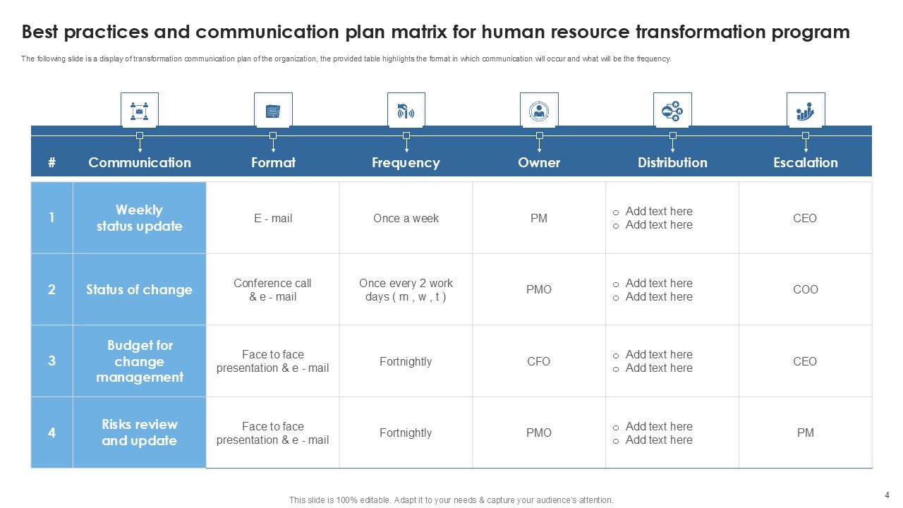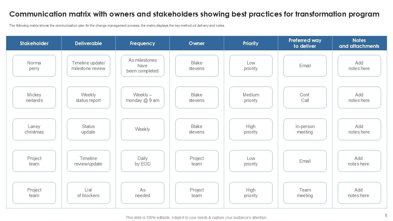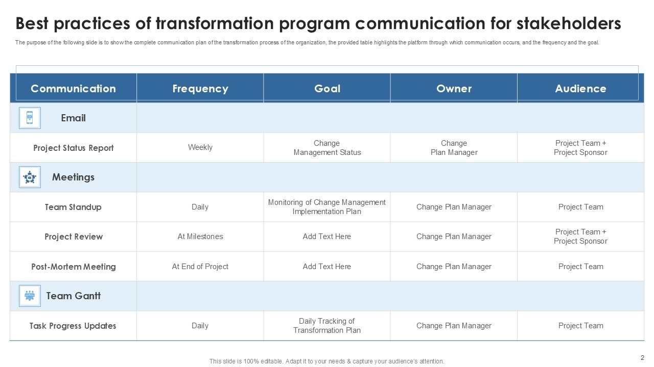 This Change Planning And Communication Strategies And Techniques Ppt PowerPoint Presentation Complete Deck With Slides is a primer on how to capitalize on business opportunities through planning, innovation, and market intelligence. The content-ready format of the complete deck will make your job as a decision-maker a lot easier. Use this ready-made PowerPoint Template to help you outline an extensive and legible plan to capture markets and grow your company on the right path, at an exponential pace. What is even more amazing is that this presentation is completely editable and 100 percent customizable. This thirteen slide complete deck helps you impress a roomful of people with your expertise in business and even presentation. Craft such a professional and appealing presentation for that amazing recall value. Download now.