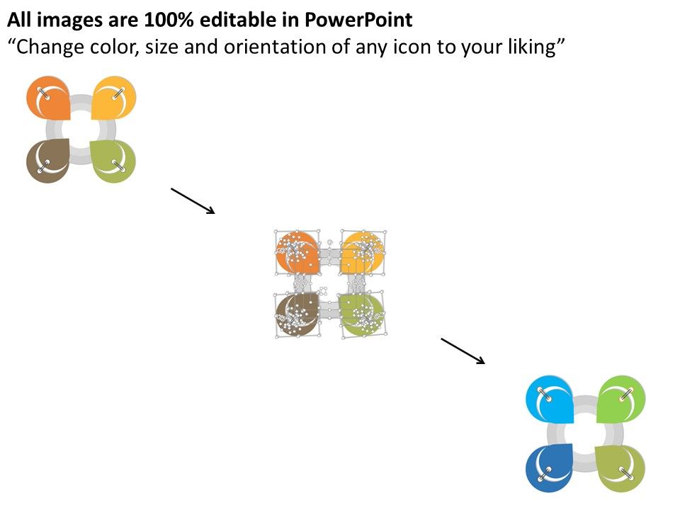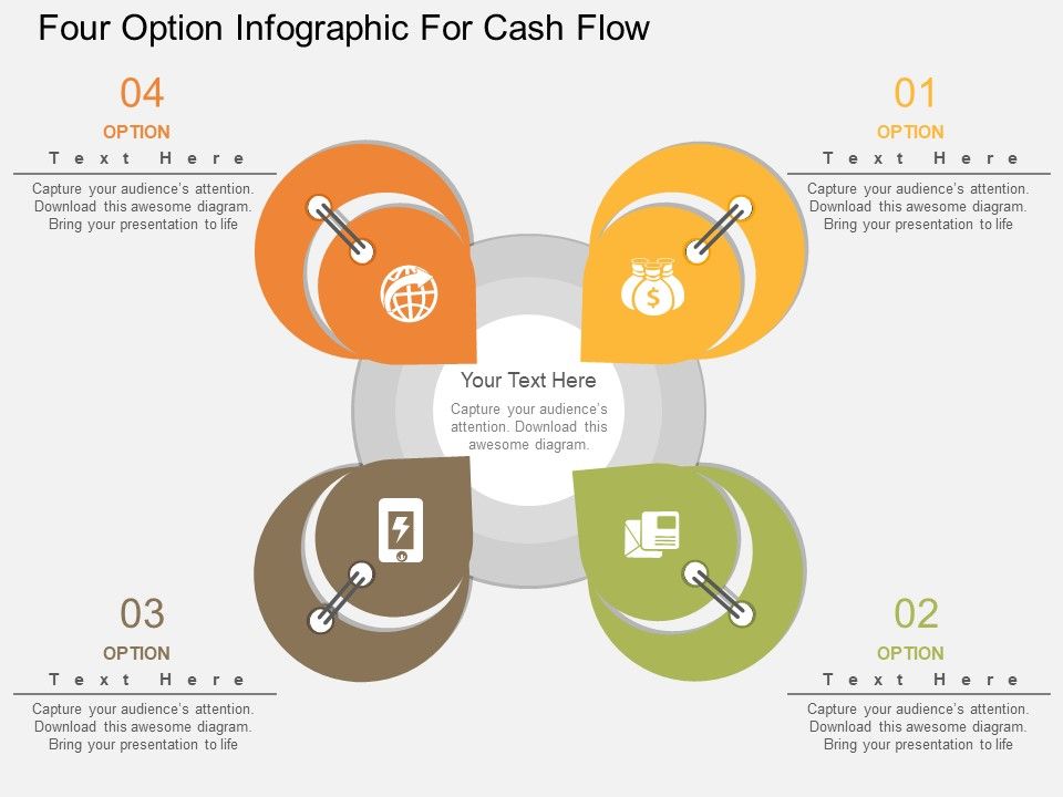 This PPT slide illustrates four options infographic diagram. You may use it to represent depict cash flow for business operations. This PowerPoint template is suitable to display business information in visual manner.