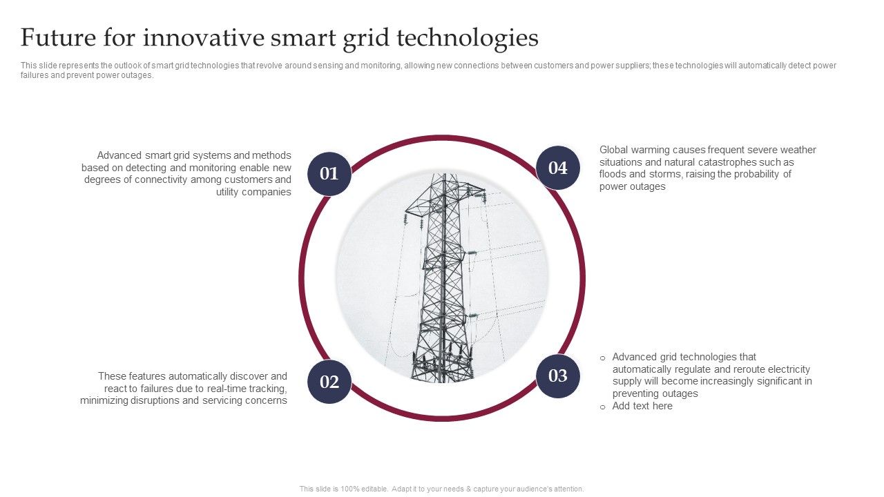 This slide represents the outlook of smart grid technologies that revolve around sensing and monitoring, allowing new connections between customers and power suppliers these technologies will automatically detect power failures and prevent power outages. Do you have to make sure that everyone on your team knows about any specific topic I yes, then you should give Smart Grid Technology Future For Innovative Smart Grid Technologies Microsoft PDF a try. Our experts have put a lot of knowledge and effort into creating this impeccable Smart Grid Technology Future For Innovative Smart Grid Technologies Microsoft PDF. You can use this template for your upcoming presentations, as the slides are perfect to represent even the tiniest detail. You can download these templates from the Slidegeeks website and these are easy to edit. So grab these today.