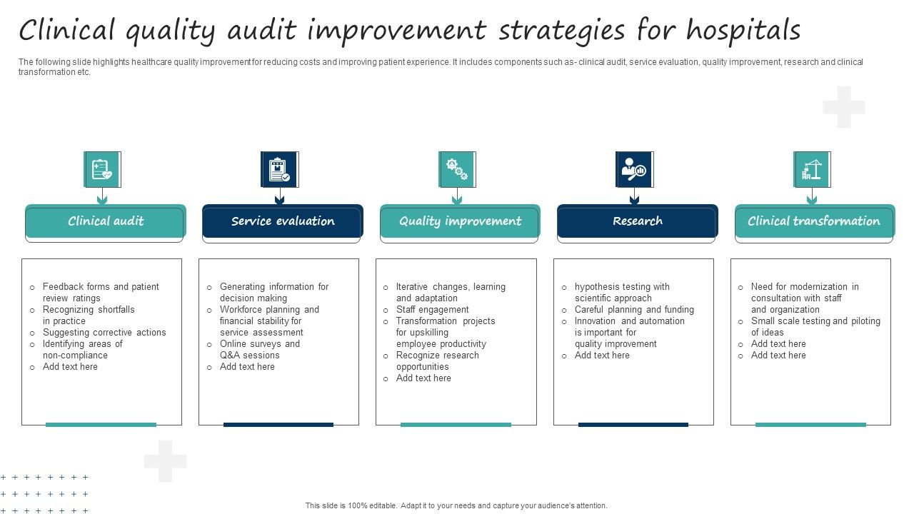 The following slide highlights healthcare quality improvement for reducing costs and improving patient experience. It includes components such as- clinical audit, service evaluation, quality improvement, research and clinical transformation etc. Presenting Clinical Quality Audit Improvement Strategies For Hospitals Topics PDF to dispense important information. This template comprises four stages. It also presents valuable insights into the topics including Clinical Audit, Service Evaluation, Quality Improvement. This is a completely customizable PowerPoint theme that can be put to use immediately. So, download it and address the topic impactfully.