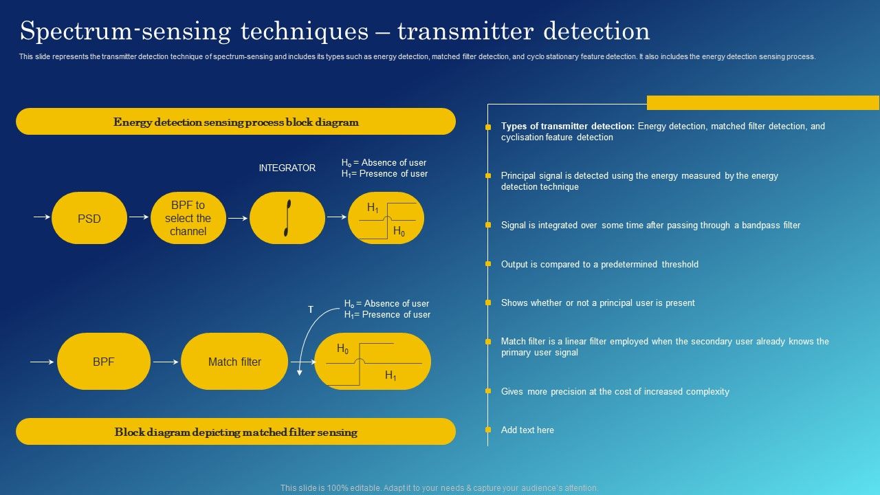 This slide represents the transmitter detection technique of spectrum-sensing and includes its types such as energy detection, matched filter detection, and cyclo stationary feature detection. It also includes the energy detection sensing process. Find highly impressive Cognitive Sensing Innovation Spectrum Sensing Techniques Transmitter Detection Infographics PDF on Slidegeeks to deliver a meaningful presentation. You can save an ample amount of time using these presentation templates. No need to worry to prepare everything from scratch because Slidegeeks experts have already done a huge research and work for you. You need to download Cognitive Sensing Innovation Spectrum Sensing Techniques Transmitter Detection Infographics PDF for your upcoming presentation. All the presentation templates are 100 percent editable and you can change the color and personalize the content accordingly. Download now