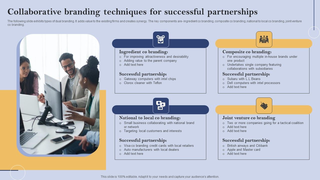 The following slide exhibits types of dual branding. It adds value to the existing firms and creates synergy. The key components are- ingredient co branding, composite co branding, national to local co branding, joint venture co branding. Presenting Collaborative Branding Techniques For Successful Partnerships Demonstration PDF to dispense important information. This template comprises four stages. It also presents valuable insights into the topics including Collaborative, Branding, Successful Partnership. This is a completely customizable PowerPoint theme that can be put to use immediately. So, download it and address the topic impactfully.