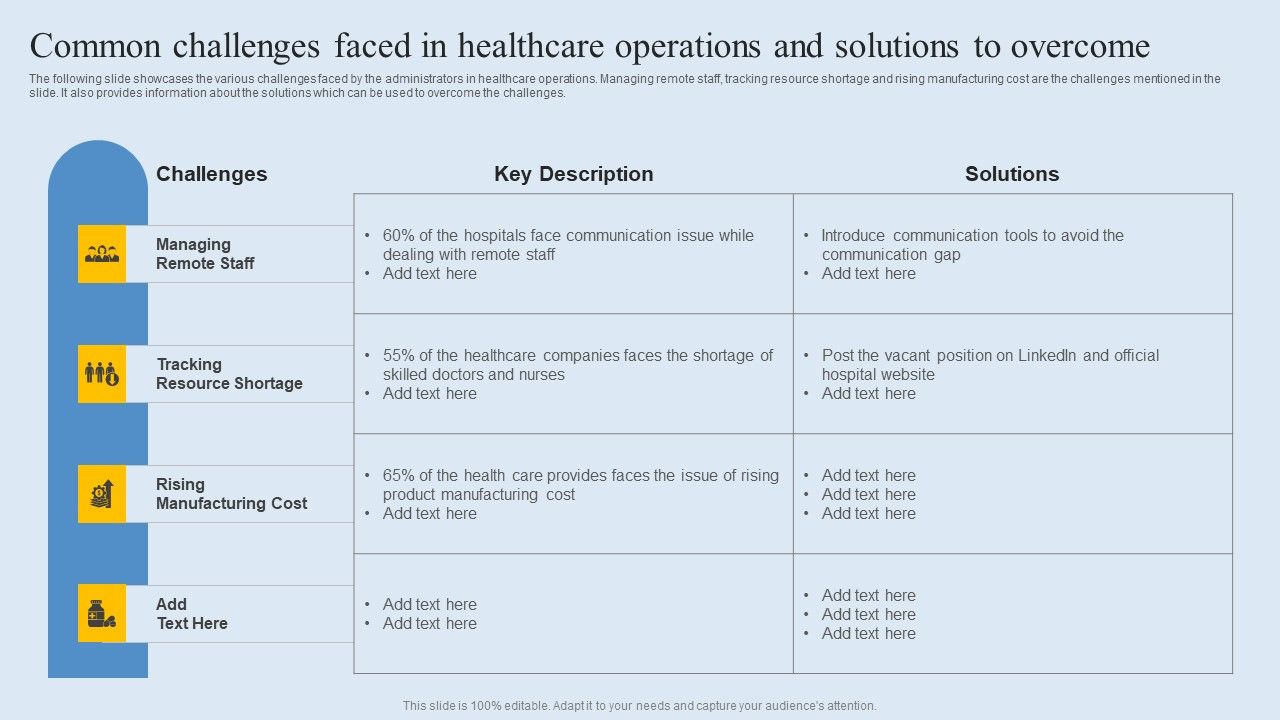 Common Challenges Faced In Healthcare Operations And Solutions To Overcome Summary PDF with all 9 slides: