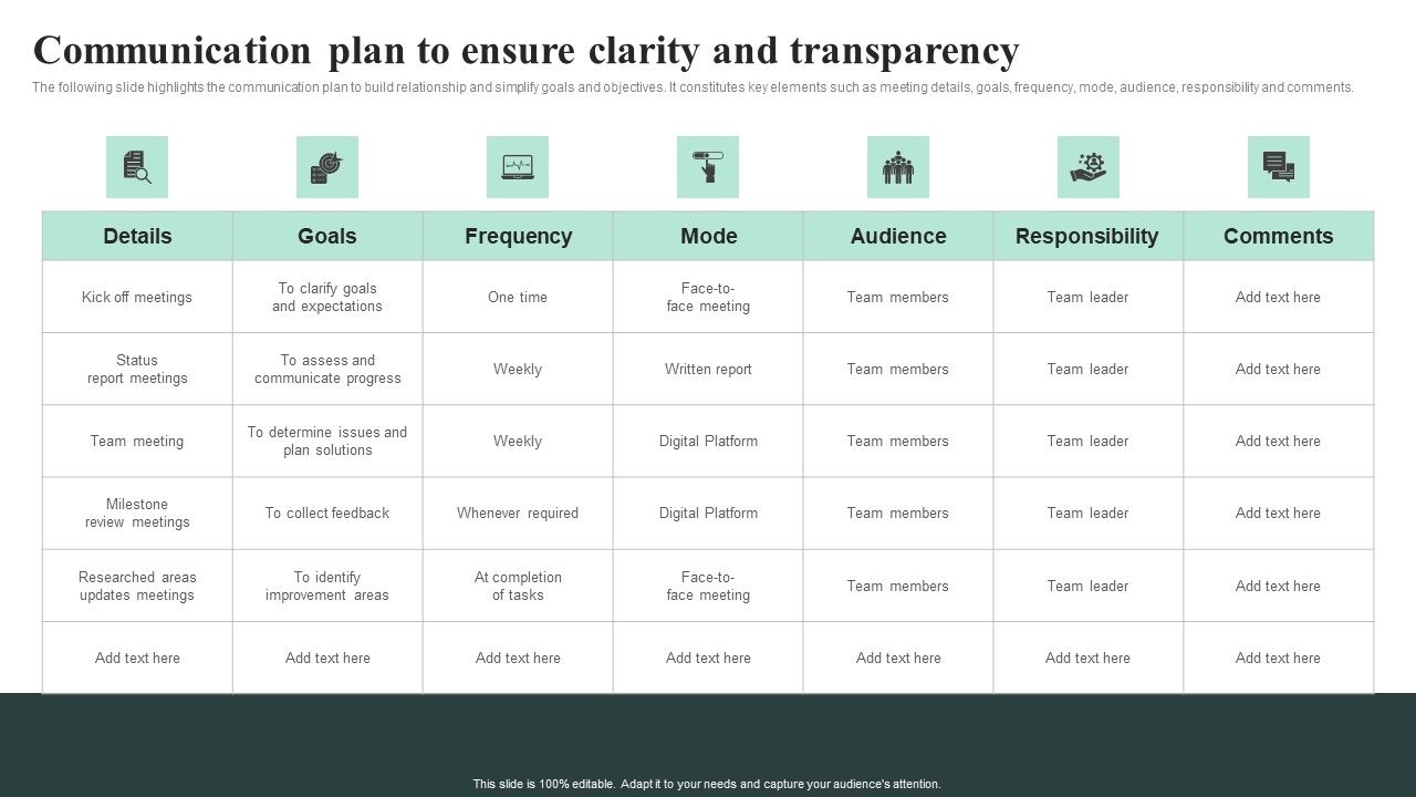 The following slide highlights the communication plan to build relationship and simplify goals and objectives. It constitutes key elements such as meeting details, goals, frequency, mode, audience, responsibility and comments. Find highly impressive Communication Plan To Ensure Clarity And Transparency Infographics PDF on Slidegeeks to deliver a meaningful presentation. You can save an ample amount of time using these presentation templates. No need to worry to prepare everything from scratch because Slidegeeks experts have already done a huge research and work for you. You need to download Communication Plan To Ensure Clarity And Transparency Infographics PDF for your upcoming presentation. All the presentation templates are 100 percent editable and you can change the color and personalize the content accordingly. Download now.