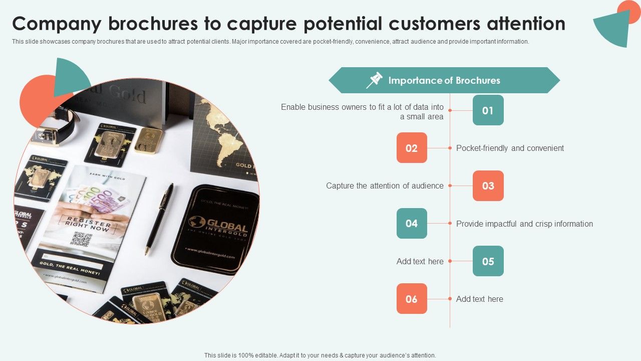 This slide showcases company brochures that are used to attract potential clients. Major importance covered are pocket-friendly, convenience, attract audience and provide important information. There are so many reasons you need a Company Brochures To Capture Potential Customers Attention Pictures PDF. The first reason is you can not spend time making everything from scratch, Thus, Slidegeeks has made presentation templates for you too. You can easily download these templates from our website easily.