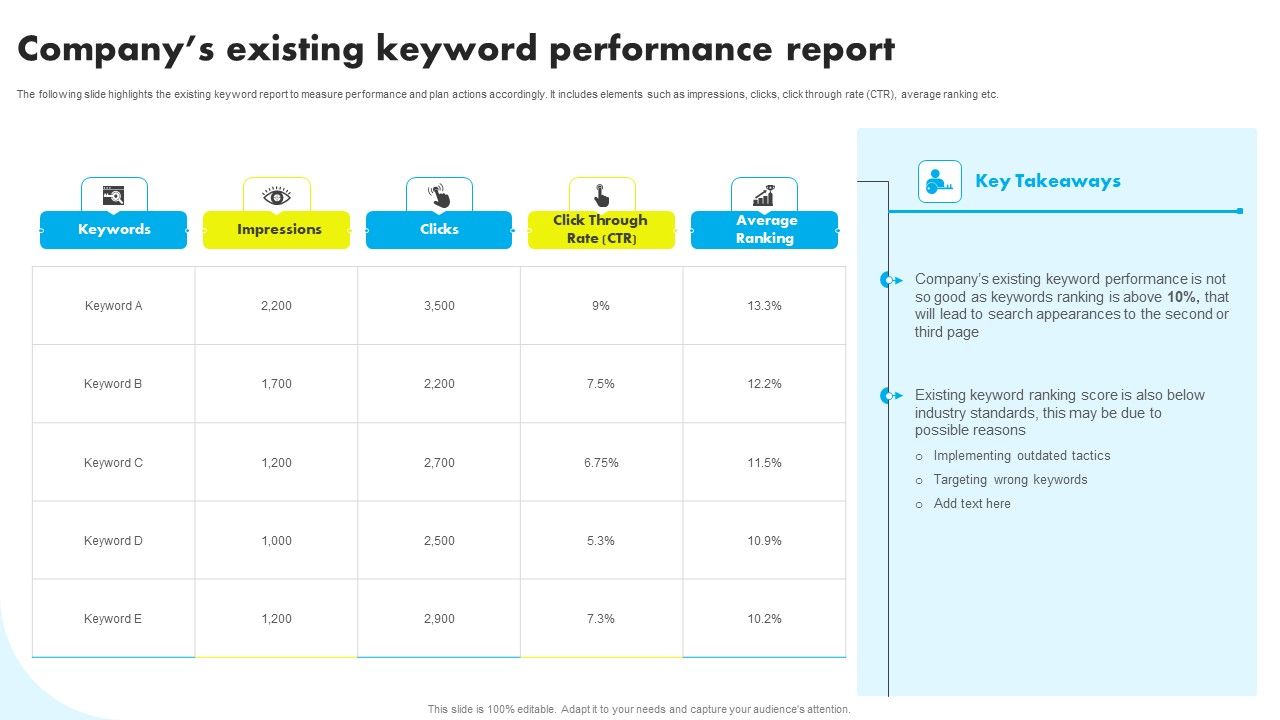 The following slide highlights the existing keyword report to measure performance and plan actions accordingly. It includes elements such as impressions, clicks, click through rate CTR, average ranking etc. Are you in need of a template that can accommodate all of your creative concepts This one is crafted professionally and can be altered to fit any style. Use it with Google Slides or PowerPoint. Include striking photographs, symbols, depictions, and other visuals. Fill, move around, or remove text boxes as desired. Test out color palettes and font mixtures. Edit and save your work, or work with colleagues. Download Companys Existing Keyword Performance Report Ppt Gallery Outline PDF and observe how to make your presentation outstanding. Give an impeccable presentation to your group and make your presentation unforgettable.