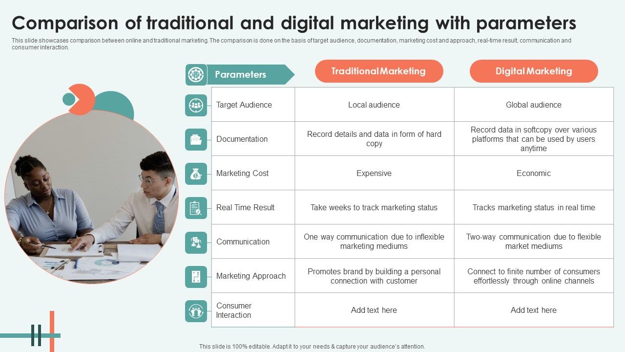 This slide showcases comparison between online and traditional marketing. The comparison is done on the basis of target audience, documentation, marketing cost and approach, real-time result, communication and consumer interaction. Do you have to make sure that everyone on your team knows about any specific topic I yes, then you should give Comparison Of Traditional And Digital Marketing With Parameters Ideas PDF a try. Our experts have put a lot of knowledge and effort into creating this impeccable Comparison Of Traditional And Digital Marketing With Parameters Ideas PDF. You can use this template for your upcoming presentations, as the slides are perfect to represent even the tiniest detail. You can download these templates from the Slidegeeks website and these are easy to edit. So grab these today.