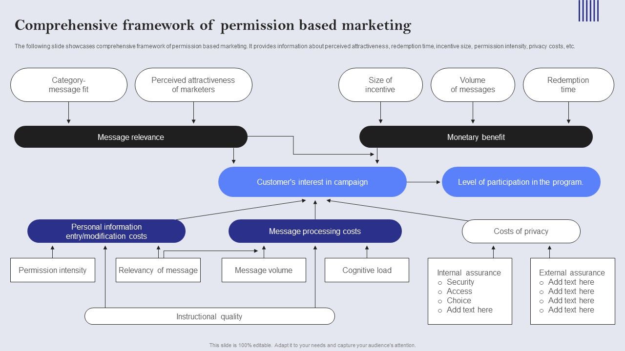 The following slide showcases comprehensive framework of permission based marketing. It provides information about perceived attractiveness, redemption time, incentive size, permission intensity, privacy costs, etc. Present like a pro with Comprehensive Framework Of Permission Based Marketing Professional PDF Create beautiful presentations together with your team, using our easy to use presentation slides. Share your ideas in real time and make changes on the fly by downloading our templates. So whether you are in the office, on the go, or in a remote location, you can stay in sync with your team and present your ideas with confidence. With Slidegeeks presentation got a whole lot easier. Grab these presentations today.