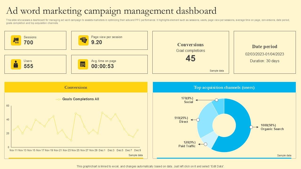 This slide showcases a dashboard for managing ad word campaign to assists marketers in optimizing their ads and PPC performance. It highlights element such as sessions, users, page view per sessions, average time on page, conversions, date period, goals completion and top acquisition channels. Welcome to our selection of the Comprehensive Guide For Sales And Advertising Processes Ad Word Marketing Campaign Management Professional PDF. These are designed to help you showcase your creativity and bring your sphere to life. Planning and Innovation are essential for any business that is just starting out. This collection contains the designs that you need for your everyday presentations. All of our PowerPoints are 100 percent editable, so you can customize them to suit your needs. This multi-purpose template can be used in various situations. Grab these presentation templates today